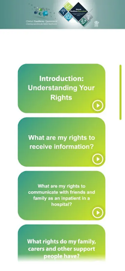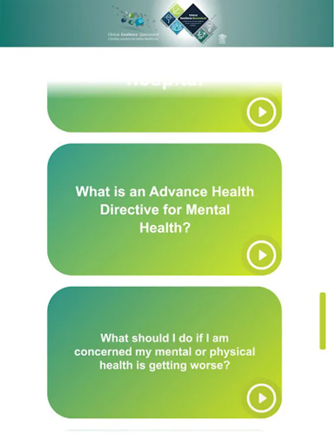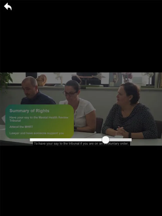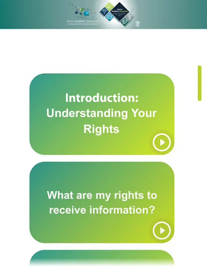 The MyRights application provides access to a range of educational videos (with captions) explaining your rights under the Mental Health Act, 2016 (Qld). The videos include: