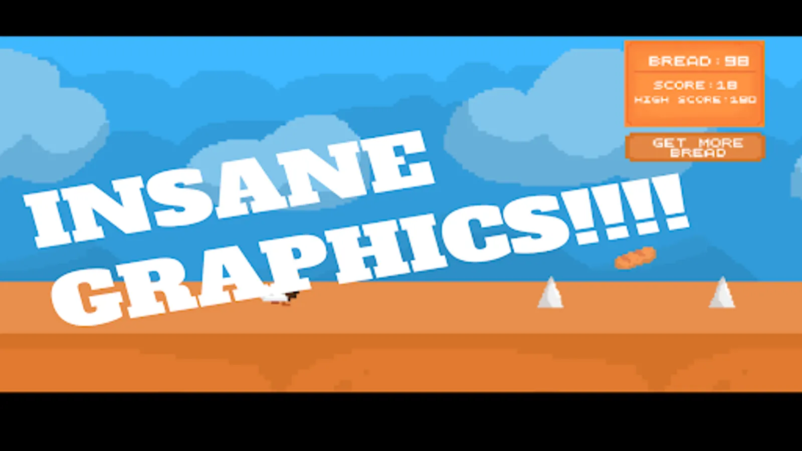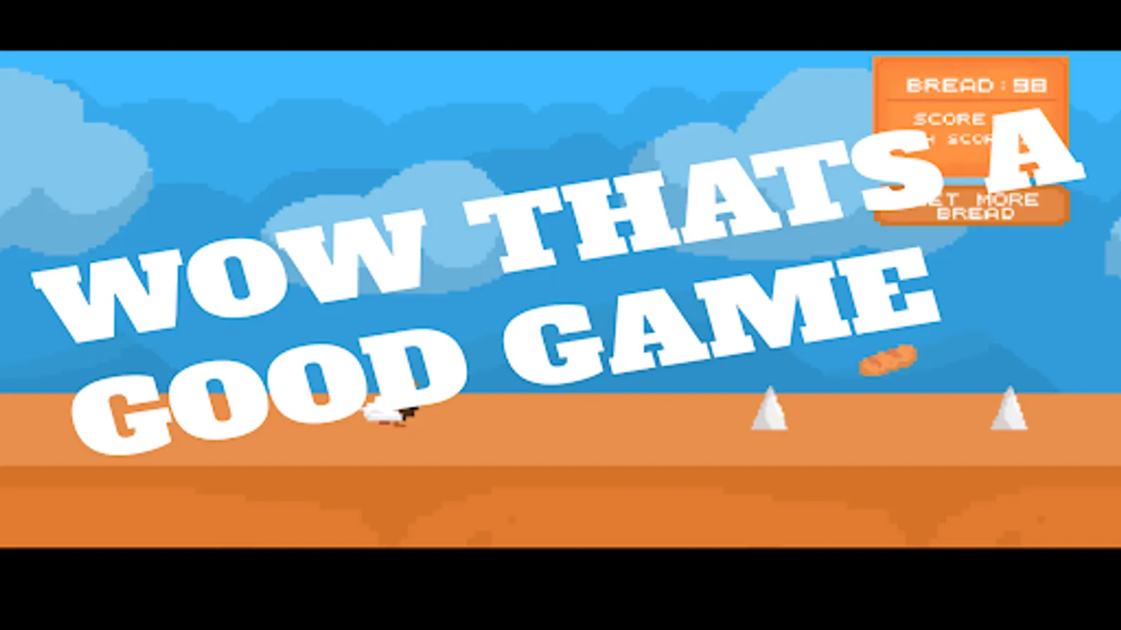 An Endless Runner where you are a duck trying to jump over spikes and missles to get that sweet bread to buy cool hats!
