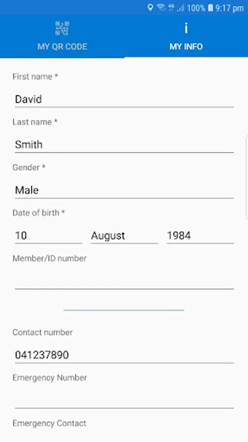 Enter your details (name, gender, date of birth, etc) and display a QR code containing those details.