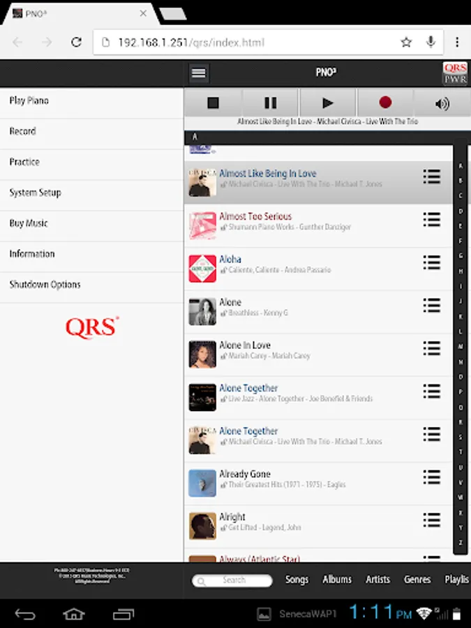 A handy app that will help you find the QRS PNOmation II and PNO3 systems on your network. Works great for Pianos in Stand Alone or Network mode. Just launch the app to be connected in a single PNO environment, or receive a listing of all PNO systems on your network by serial number. Just Tap the serial number to load the PNO web app.