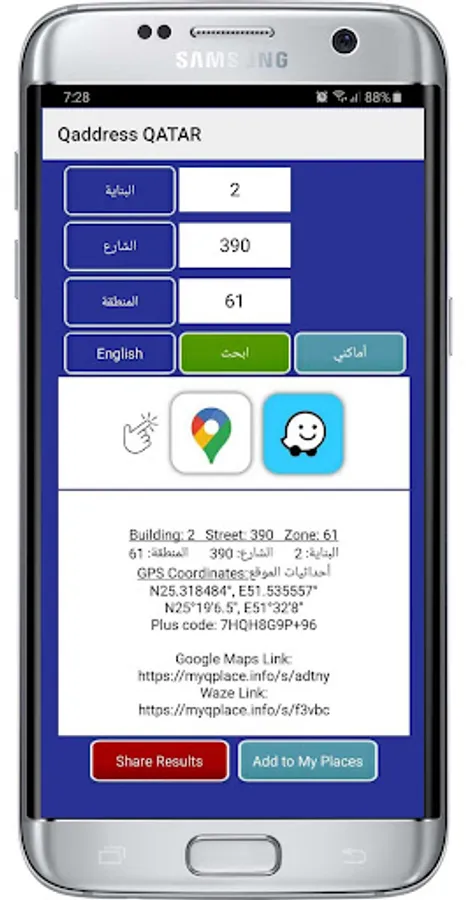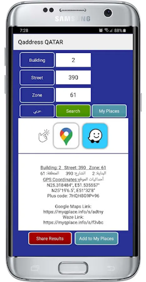 Qaddress is a simple application useful to find the map location and GPS coordinates of places in Qatar based on the new Qatar Area Referencing System (QARS). All what you need is the address numbers of the building (not its name). This application work for all areas of Qatar such as Doha, Wakra, Al-Khor and others.