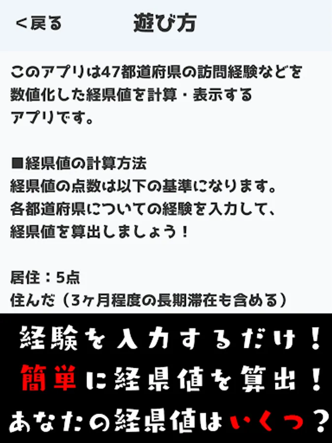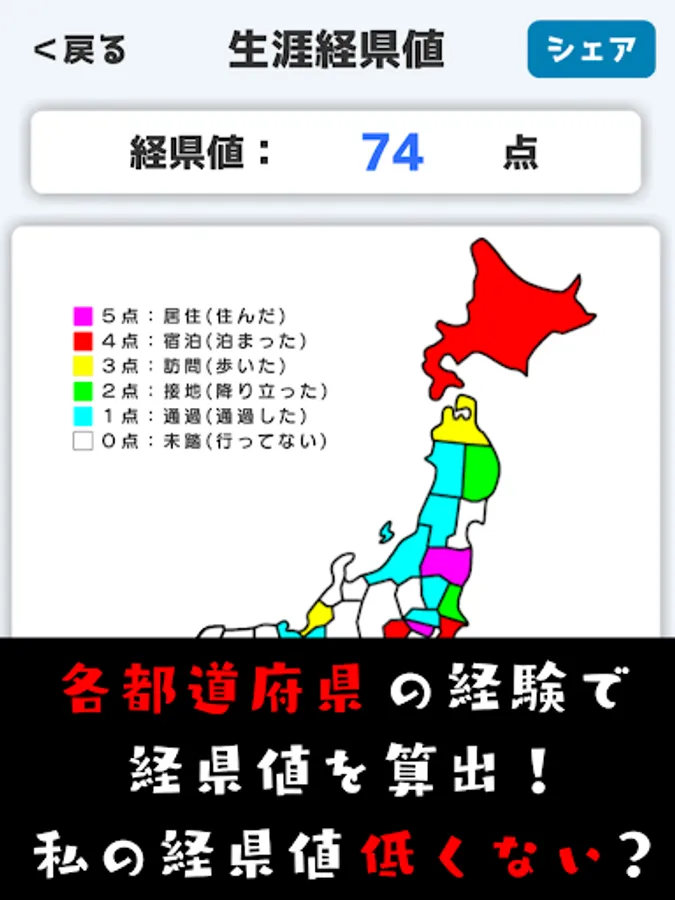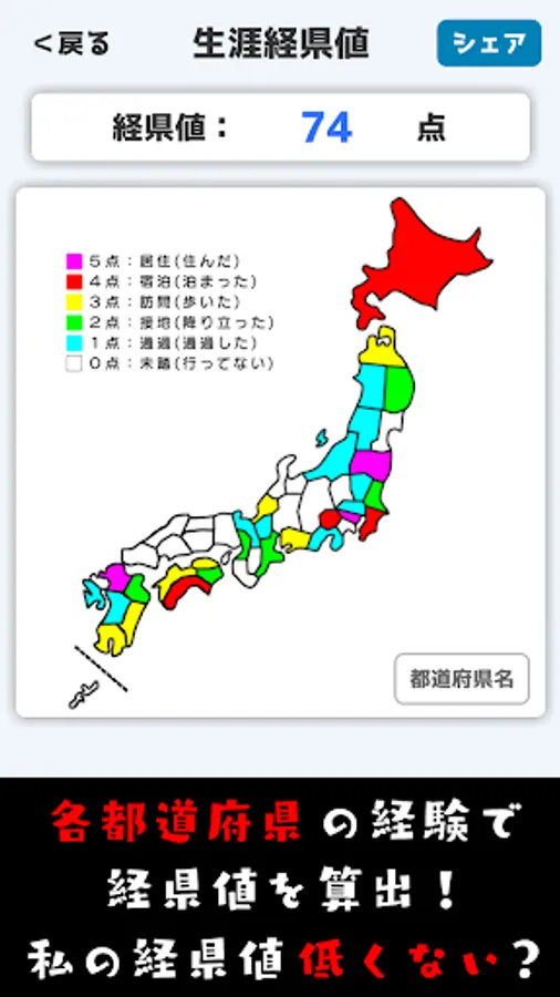 "Keiken value" was devised on the bulletin board "Doodle book" where geography enthusiasts gather on the geographic information site "Prefectures and Municipalities". The experience of 47 prefectures nationwide is divided into 6 levels, and the total score of 47 prefectures is used as the person's "prefectural value". In addition, the map of Japan where these prefectural values are colored is called a "prefectural value map".