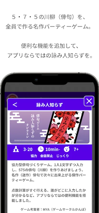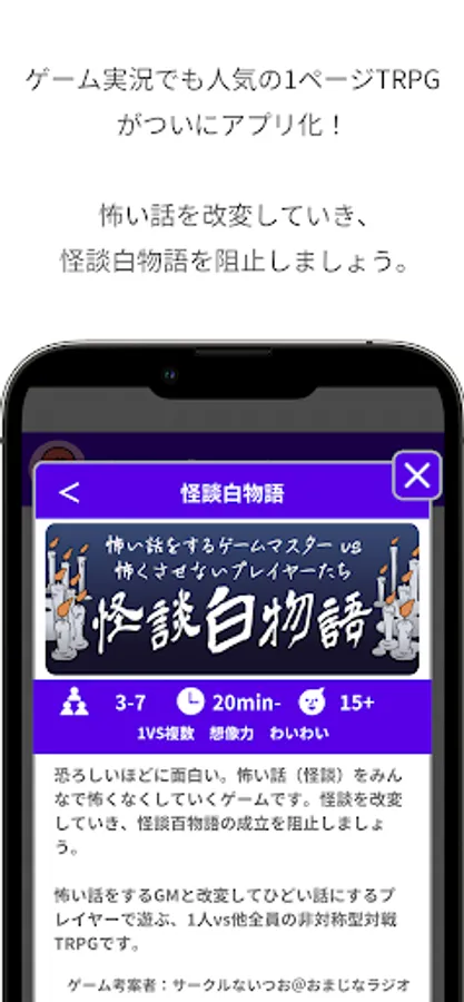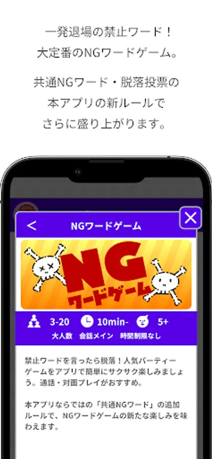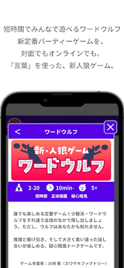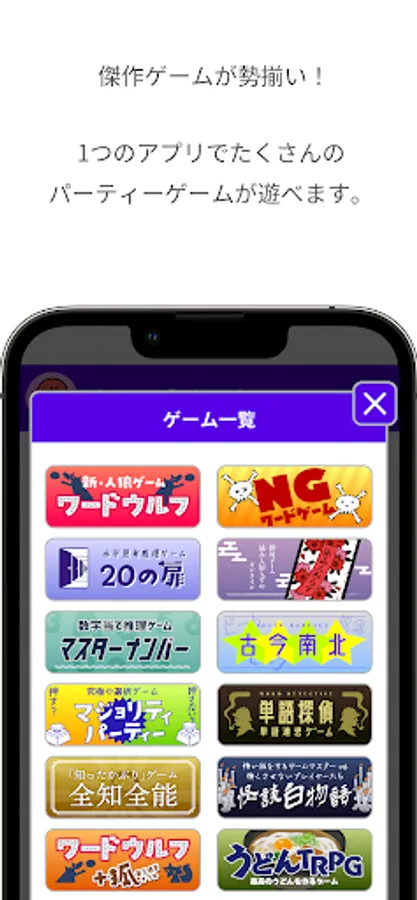"Word Wolf," a new werewolf game using words, "20 Doors," a lateral thinking game within the app, "Unanimous Game," which wins by matching everyone's answers, and "Guess the answer of one person," a quiz game. 100 Questions”, “Kwaidan White Story” that makes scary stories less scary, “Majority Party”, the ultimate choice party game, “Omniscience and Almighty”, a game that pretends to know who you are Online version of soup (lateral thinking game) "Umigame Online", udon making and presentation "Udon TRPG", Haiku (Senryu) party game "Yomihito Shirazu", team battle association game "Word Detective", Yamanote line game A masterpiece party game "Kokin Namboku" with trap rules, "Master Number", a new game in the number guessing logic game genre such as Hit and Blow and Numeron, "Psychological Janken", a mental game of Janken, Kukuri Talk Variety You can also play with the program TRPG "Are Talk!".