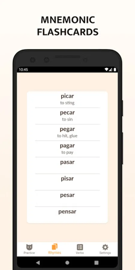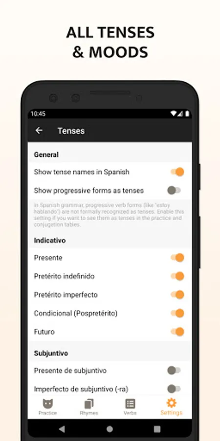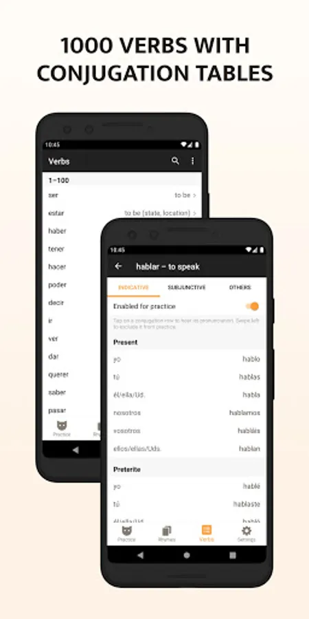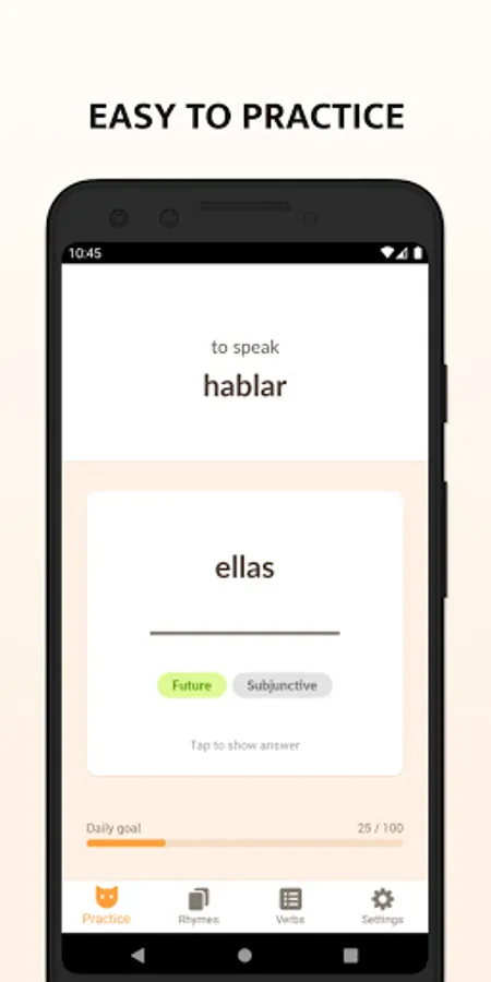 With ConjuGato, you don't need to type the answers – just think or say the correct verb and tap to check for yourself (you can enable the typing option in settings, if you wish). This is the perfect app for training your conjugation skills on the go, whenever you have a free minute.