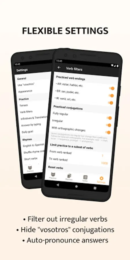 • Flexible settings: practice verbs based on irregularity, endings or popularity