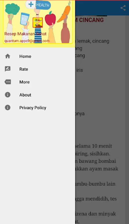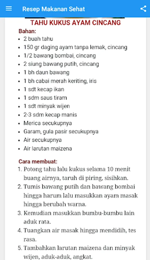 Healthy Food Recipe is a choice for us in determining the food menu that we consume so that it supports the nutritional needs of the body. By paying attention to what we consume, it can encourage our body to work optimally. In the Healthy Food Recipe application provides an option for us to prepare a menu of dishes that we will consume. Thus, through Healthy Food Recipes, our body will get good nutrition and is indeed needed by the body so that it will make our body healthier.