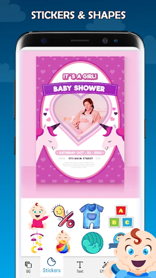 The girls are cute, soft, and very cute. To create beautiful designs that convey everything that a cute baby is, this app offers you photographs and graphics, and stickers. In addition, you can upload your own images, to customize the designs to the maximum. Surprise the future mother by creating professional designs, so that she knows how important it is to you.