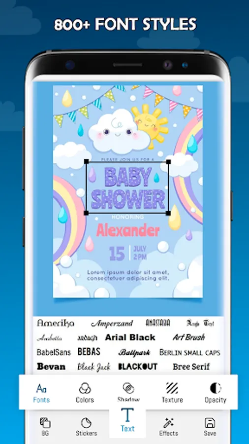 In Baby Shower Invitation Card Maker beautiful Collection of Cards , stickers , messages , text fonts and color to make Baby Shower Card more stylish . You can edit card ,quotes text , name easily.
