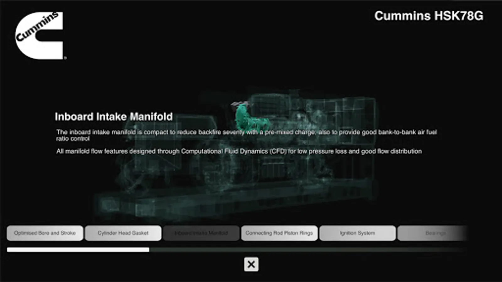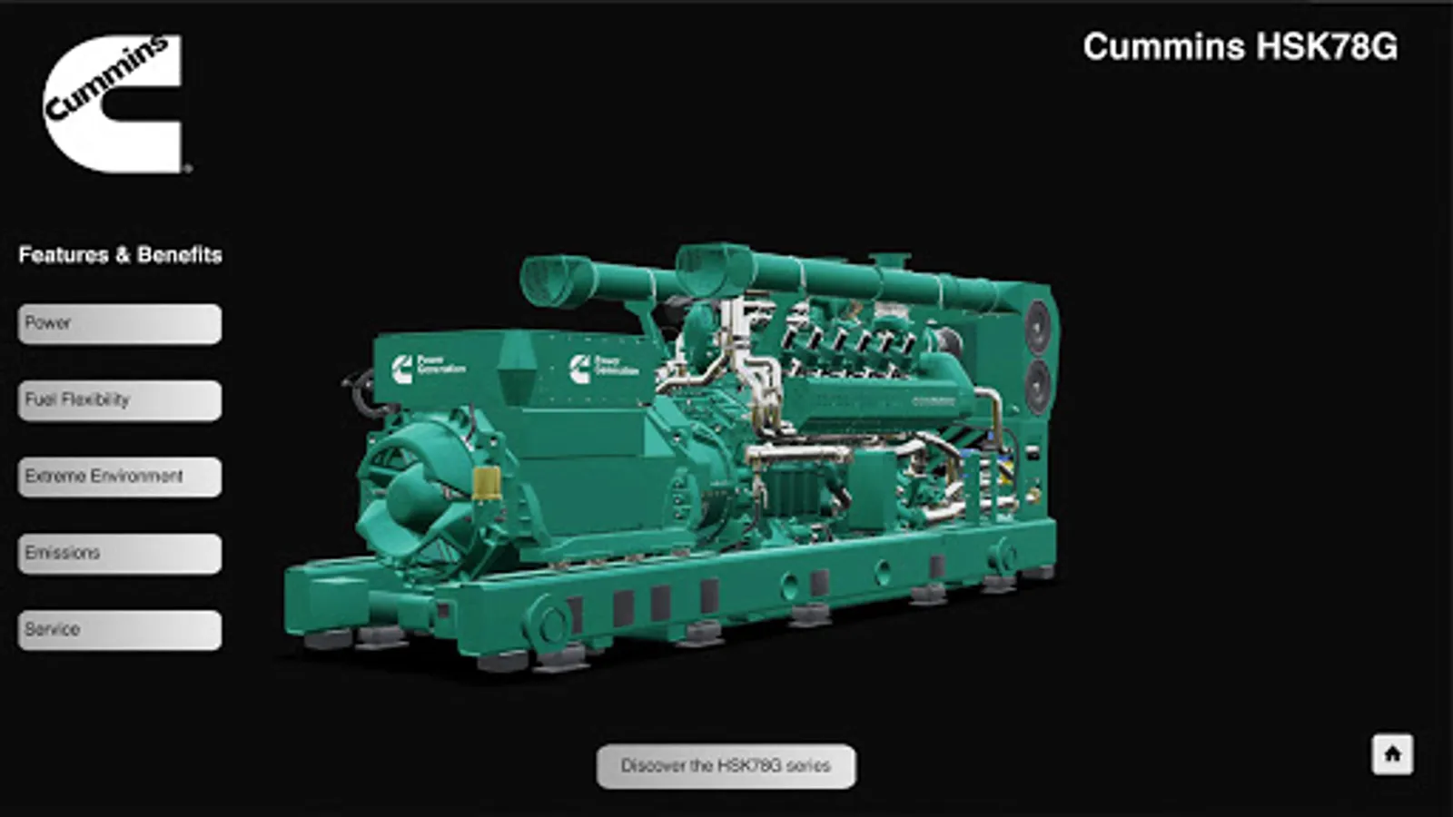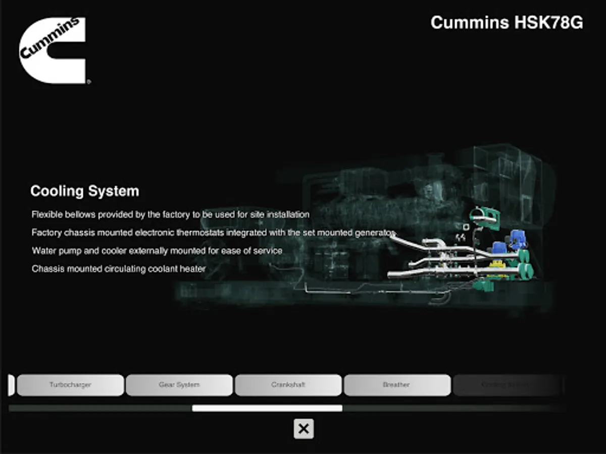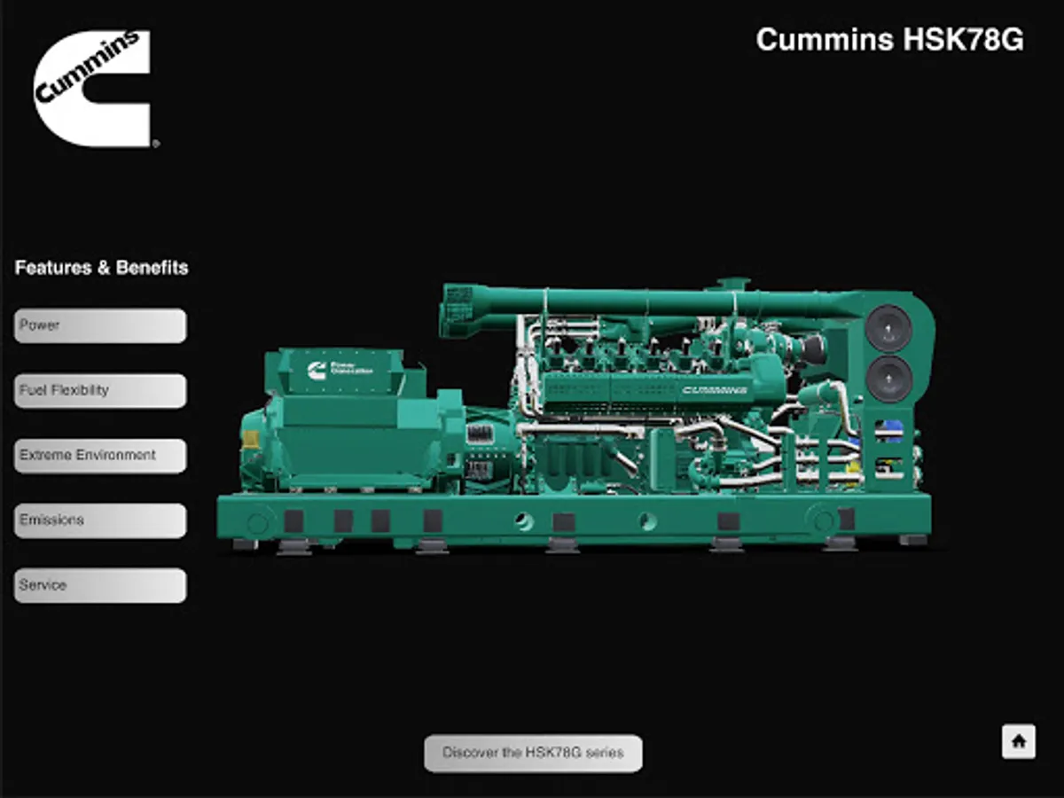 Within this application, you will be able to experience the new Cummins HSK78 gas generator series in 360 mode. The key components and benefits of the product are highlighted in real time animation to educate you on all the extreme capabilities of the gas series.