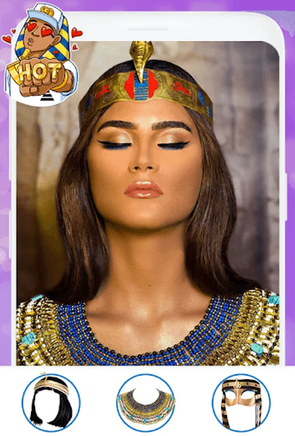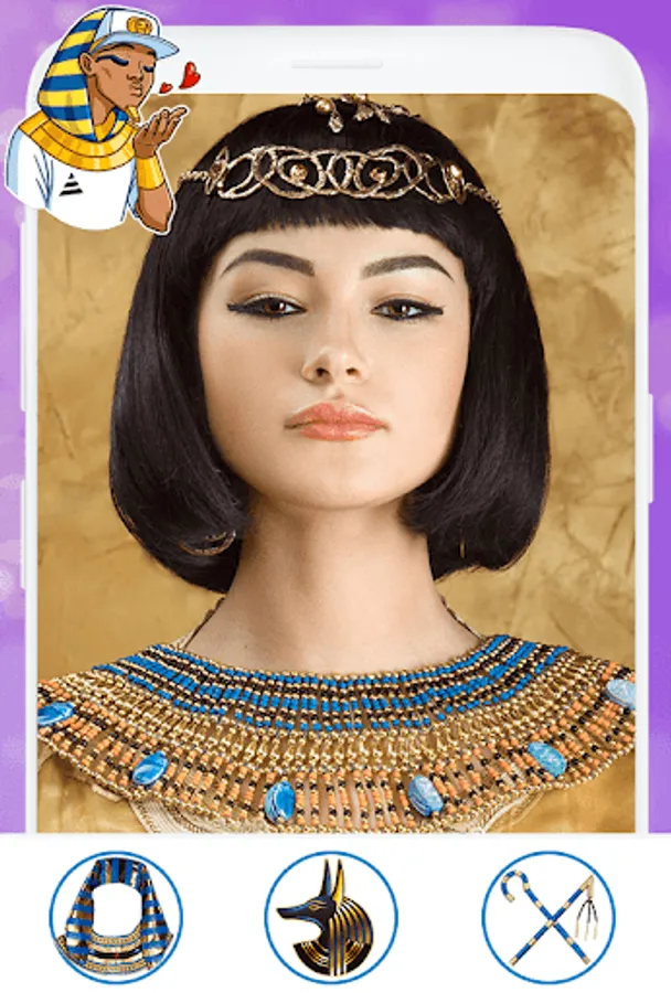 You are in the perfect place if you want to turn you into a great pharaoh or if you want to look like a great Egyptian goddess. If you like queen Cleopatra this Egyptian pharaoh photo editor application will help you to modify the face using Egyptian accessories, this is specially created for you to make all your pictures look incredible. You can turn in a few seconds into the most beautiful Egyptian. Use all the accessories that we have prepared to make your old pictures look modern, but in the same time do not forget that you can make a new photo to use in this editor.