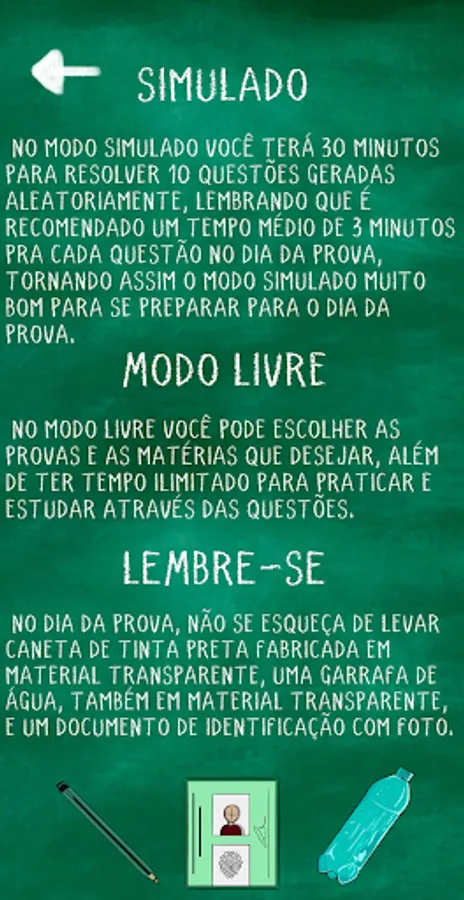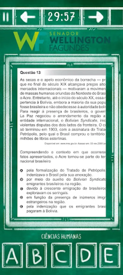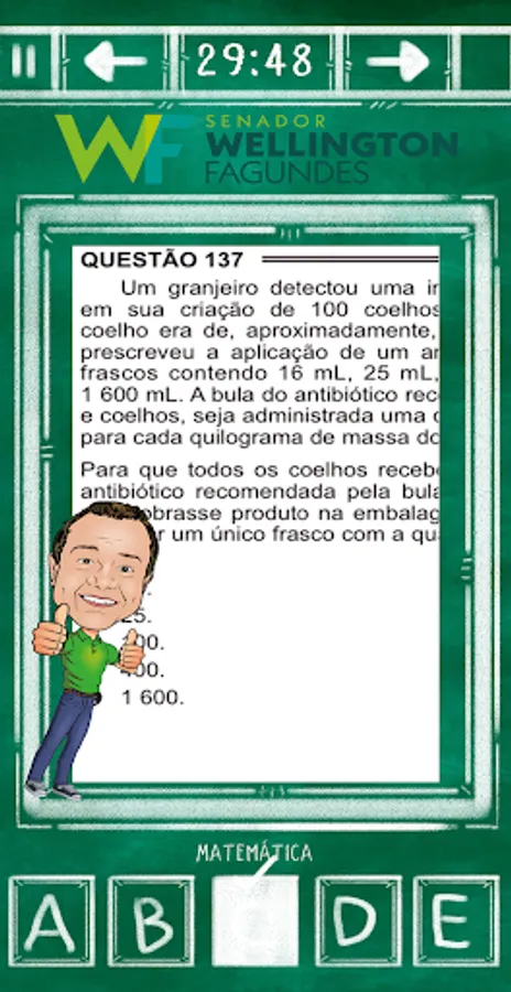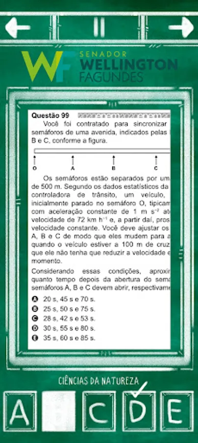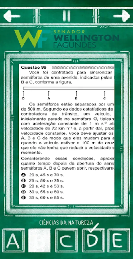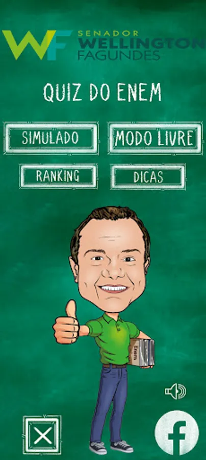Senator Wellington Fagundes, wants to help you prepare for the big day, the day of the Enem test, this game will prepare you for all subjects, with all the test questions from 2010 to 2021. The game contains free mode , in which you can choose the tests and subjects you want to practice, and a simulated mode, with randomly generated questions and a countdown to simulate the day of the test.