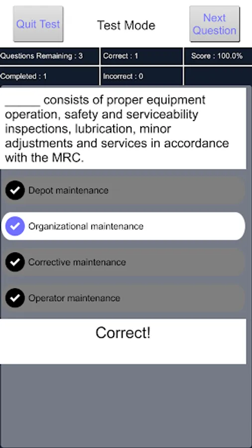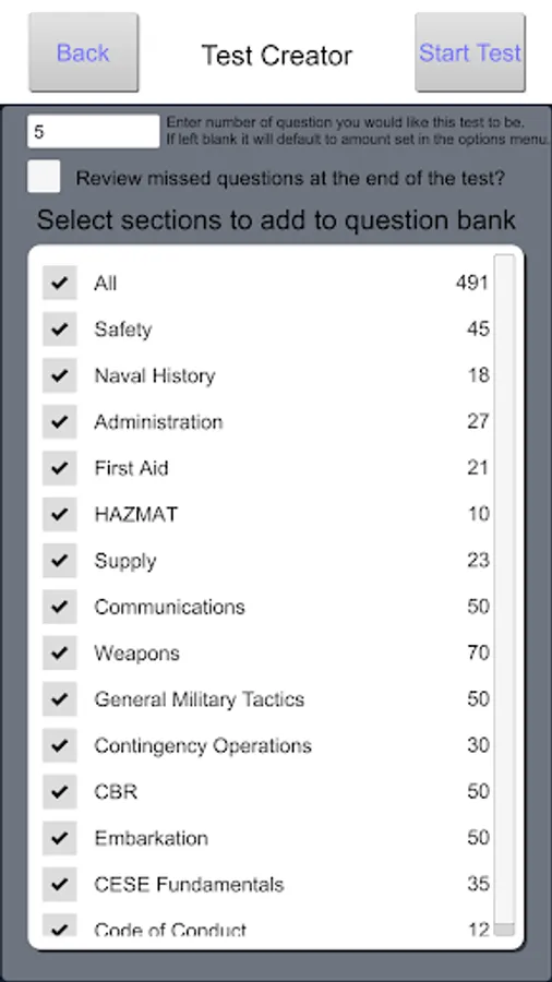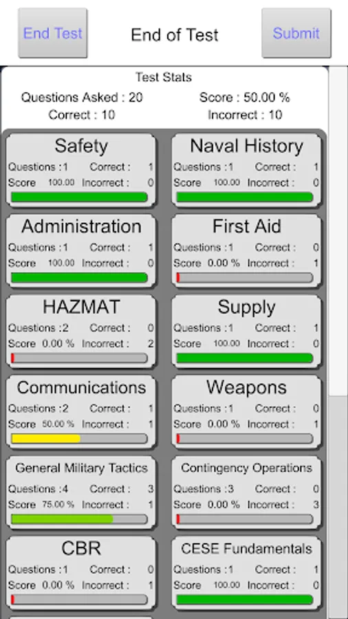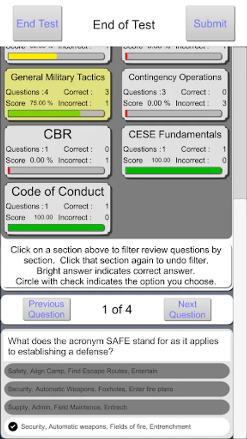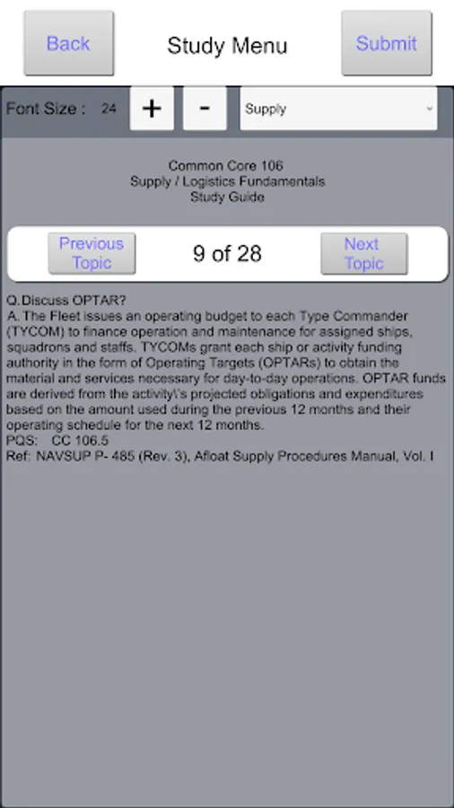 Test environment now allows configurable tests. You can select a section, group of sections or all sections to test on. You can also set the number of questions that you will take in a test. Upon completion of a test you will receive a breakdown of how you did overall and per category. This can help you to guide your training to sections where you may not be very strong. Also after a test you review all the questions you took during that test, see the correct answer and the answer you choose and filter review questions by category to quickly see mistakes. Study mode has been revamped and now allows you to change the font size as well as showing the PQS objectives one at a time to help you focus on the particular section rather than having to scroll through pages of information.
