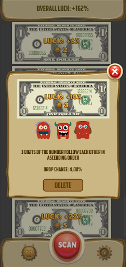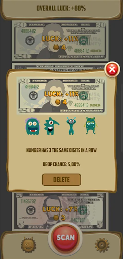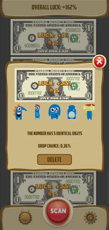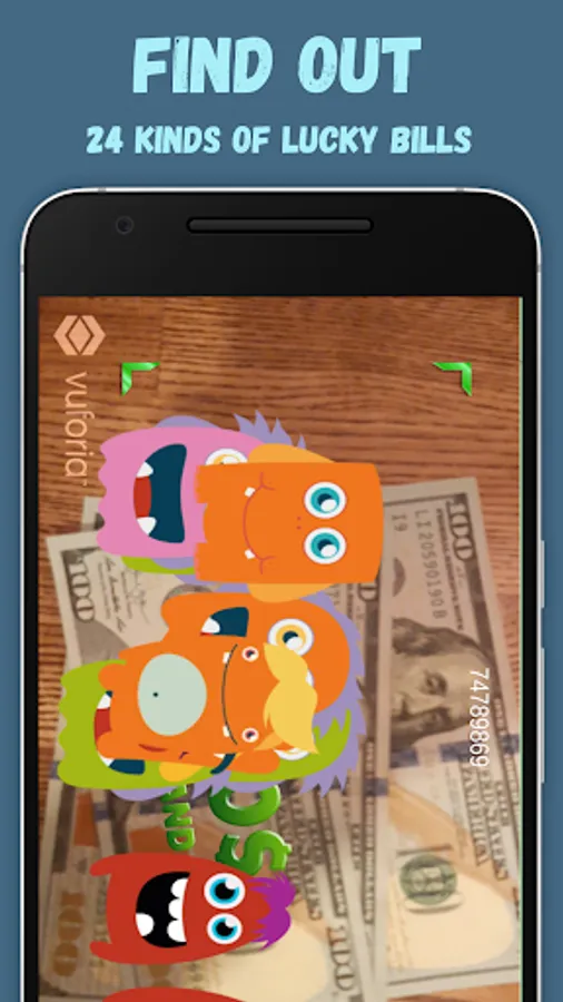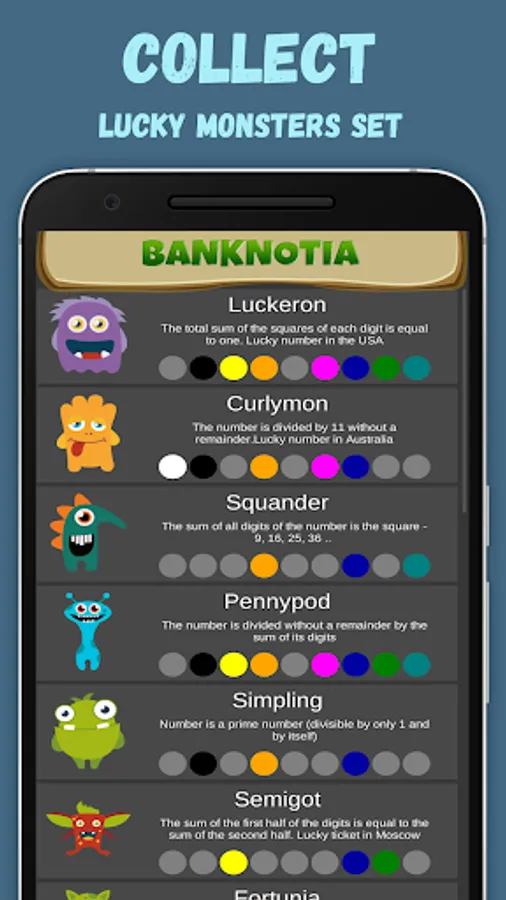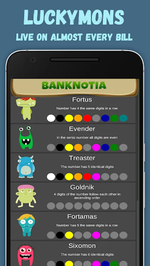 👾 Every criterion of luck looks like a cute monster. It's a Luckymon (lucky monster). If it lives in your bill, it means it's lucky. There are 288 kinds of monsters in the mobile app.