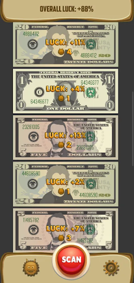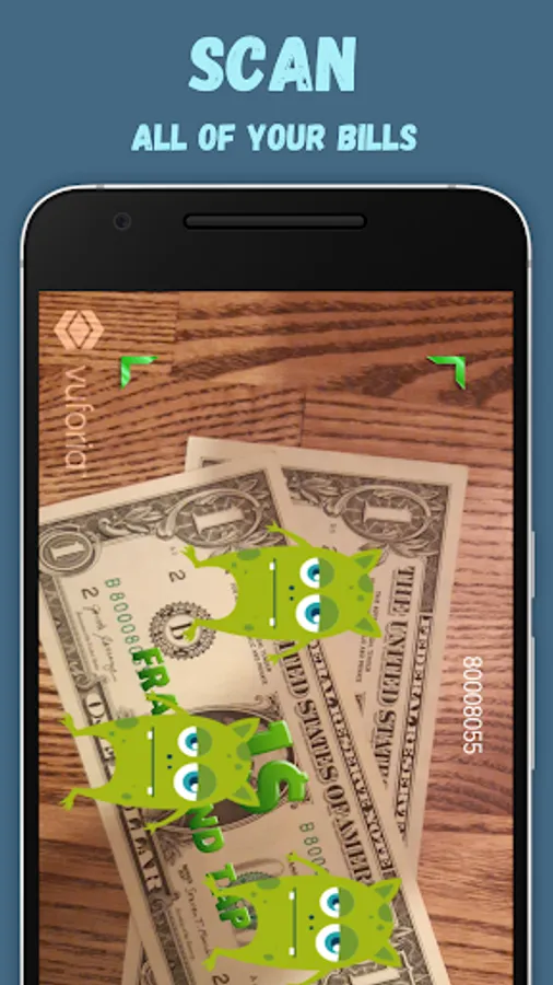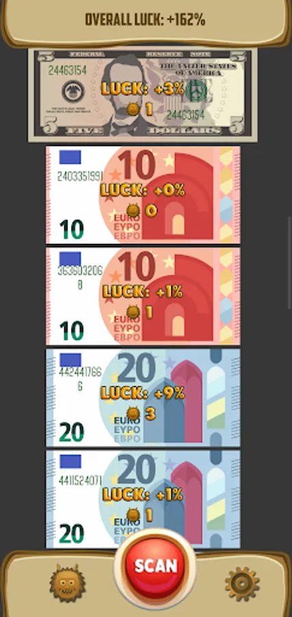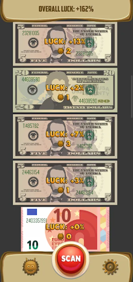 Press "Scan" button. Point your camera at a dollar(euro) bill. Tap the screen. Save most luckiest bills.