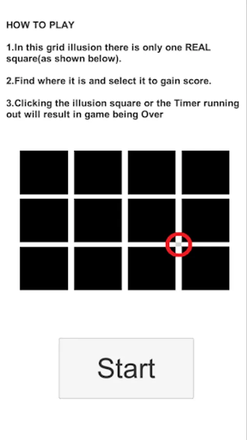 In this illusion there is only one REAL square.Find where it is and select it to gain score.Clicking the illusion square or the Timer running out will result in game being Over