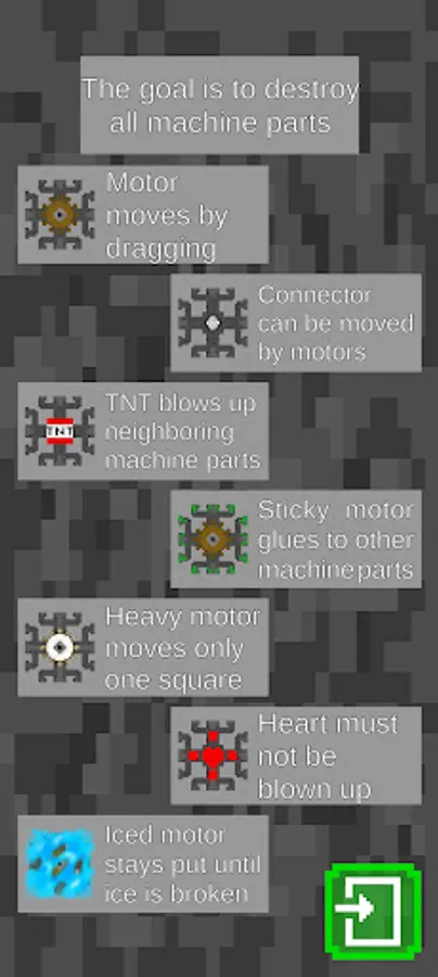 The goal of the game is to move the machine parts so that they can be destroyed and then the level is cleared. As the game progresses more machine parts are discovered with interestring properties