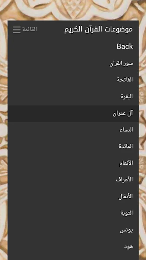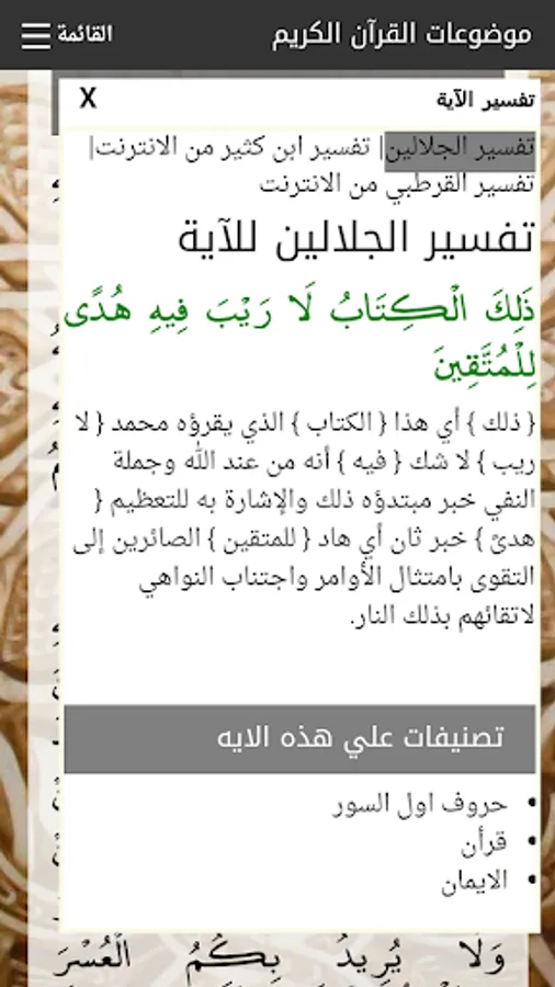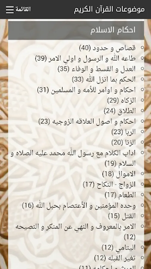 Quran By Subject categorizes the Arabic ayas or verses of the Holy Quran by subject. It has more than one hundred subjects including all the stories of the prophets in the Quran as well as very useful subjects such as.