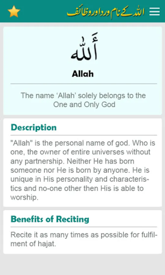 99 Allah Names (Asma ul Husna) with Meaning in Urdu, English & Malay Languages. This App has MP3 Audio with Elegant Video Animation. Allah Names App has Wird & Wazaif Detail for Every Allah’s Name in 3 Languages. This App is perfect for everyone in this Ramadan 2021, We can find the solution of our problem through Allah Name's Wird & Wazaif. If you want to Memorize 99 Names of Allah, if you want to Listen or if you want to watch Animation of Allah Names with Audio then this App for you.