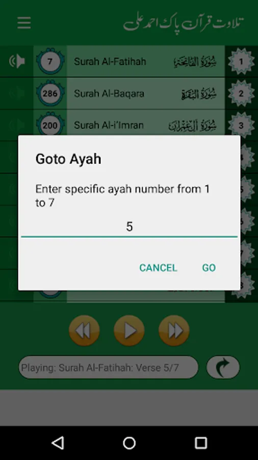 • Goto Ayah Feature (Jump to specific ayah of selected surah)