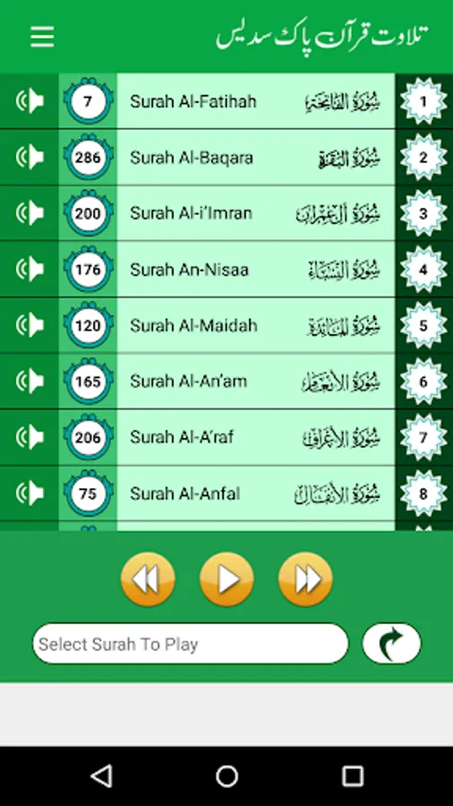 This App allows creating Multiple Play Lists of Surah, after creation load your specific playlist and listen all play list surahs continuously. Goto Ayah Allow you to Jump on specific Ayah of Selected Surah. This App work smartly to save your battery consumption, even you can listen Quran while mobile on the standby mode.