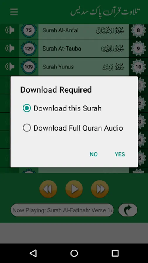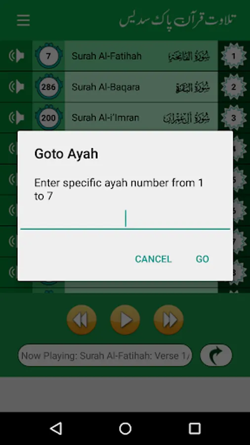 • Goto Ayah Feature (Jump to specific ayah of selected surah)