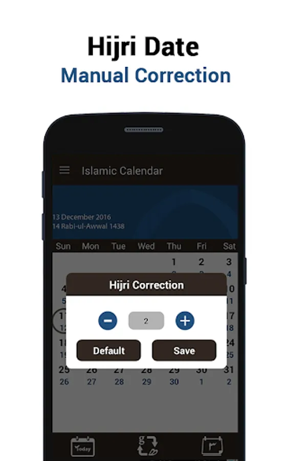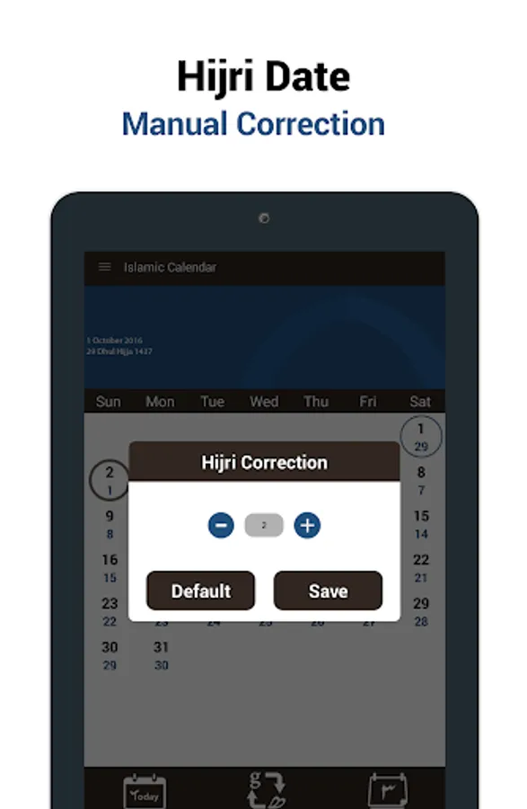 • Hijri Correction lets user adjust and save its preferred Modification to the Calendar.