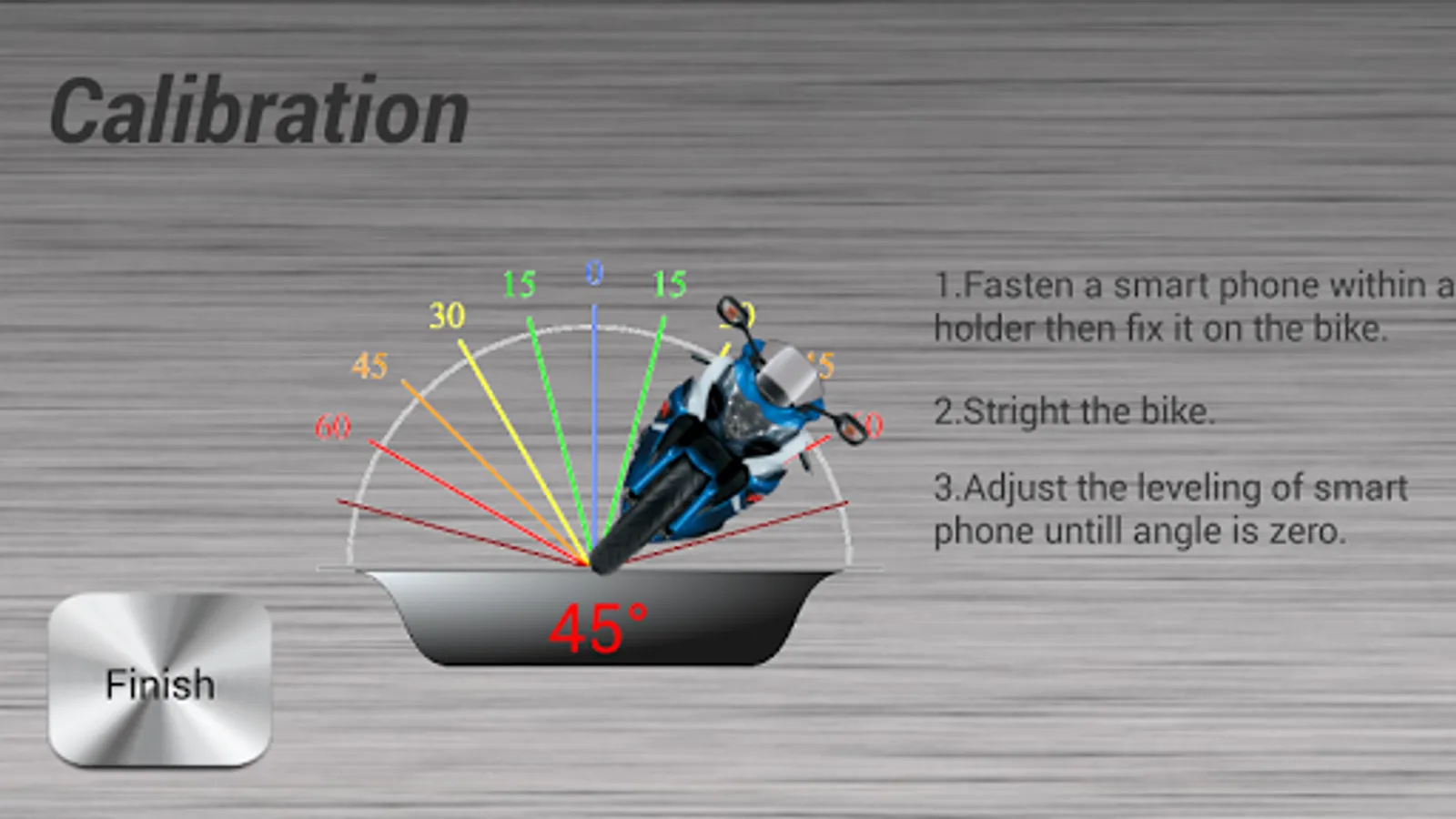 3. Make the bike stand straight, use "Calibrate" function of APP to adjust the leveling of smart phone until lean angle is zero.