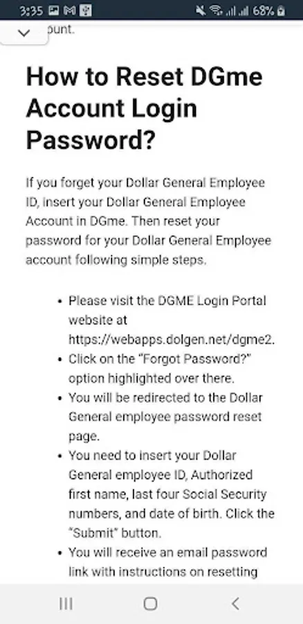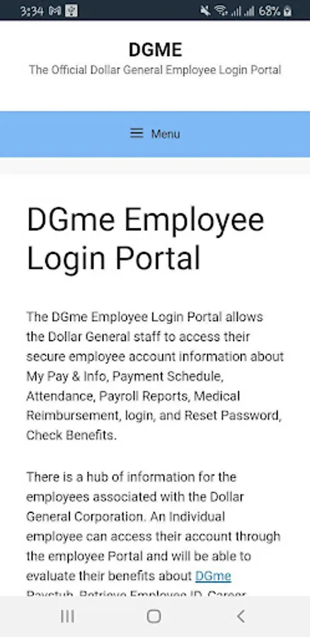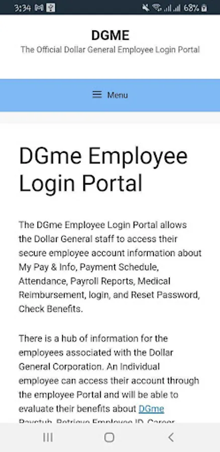 The DGme Employee Login Portal allows the Dollar General staff to access their secure employee account information about My Pay & Info, Payment Schedule, Attendance, Payroll Reports, Medical Reimbursement, login, and Reset Password, Check Benefits.