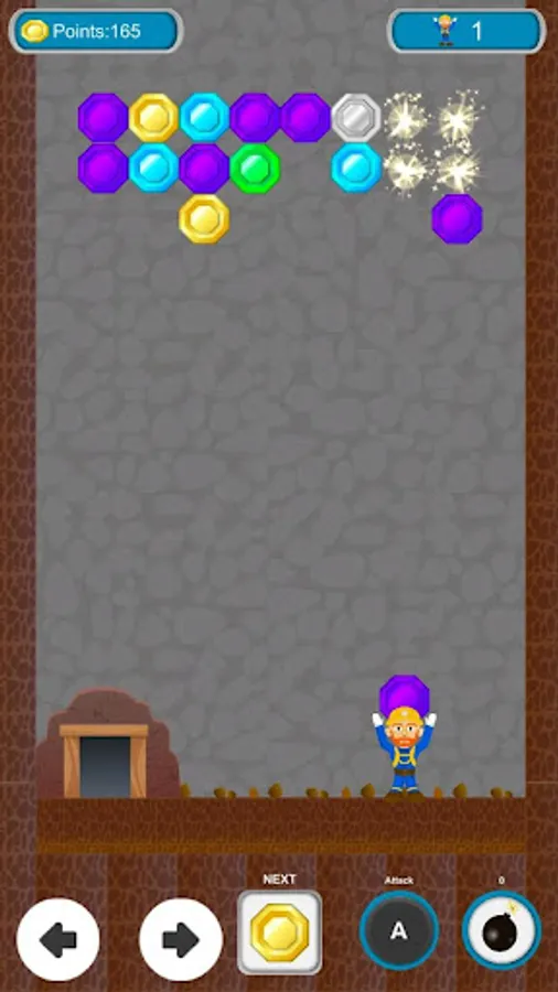 It is about a miner who must prevent the roof from collapsing. The objective is to combine gems by colors. To thus eliminate them. Different gems with different values can be combined. The more gems you eliminate, the more score you receive. Also when reaching certain points you get a bomb that allows you to eliminate all the rows. The game advances level as you add more points. As the level increases the speed at which the gems drop is higher.