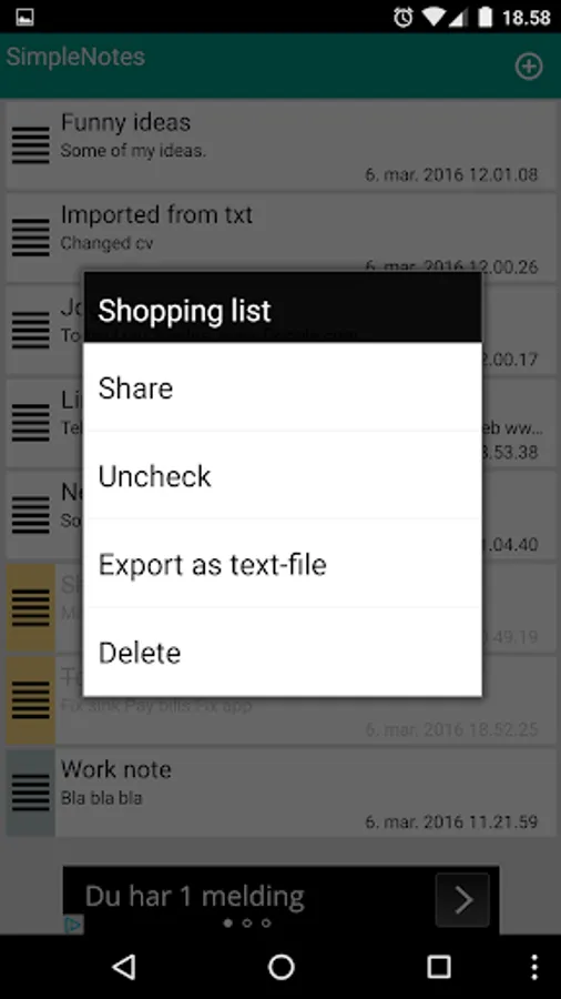 Can export, import and share notes with other apps (email, twitter, facebook, sms +++).