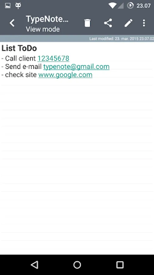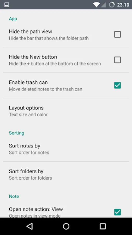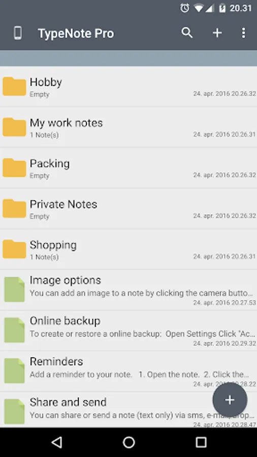 A simple notepad that lets you organize your notes by folders. Also has functions to send notes (facebook, email, dropbox, sms +++), add image from album or camera, import and export files(txt), backup and restore locally or online (Dropbox). The app can also be locked and protected with a passcode.