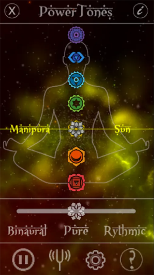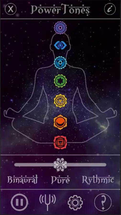 Audible Acupuncture is an app that uses mathematically derived tones from planetary movements to tune your Chakras and energetic body. Each Chakra is tuned to a specific planetary body, the orbit of which is converted into a sine wave which emits a specific frequency, tuned up in Octaves to match the human range of hearing. The Tones can be listened to as Binaural, with custom frequencies, Pure Tones, or Rhythmic with a specific beat based on the oscillating mathematics. The interface allows for full customizability of the Planet-Chakra assignment as well as the offset frequency for the Binaural Tones.