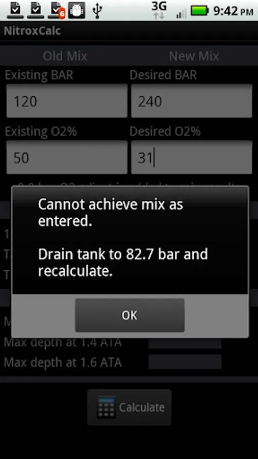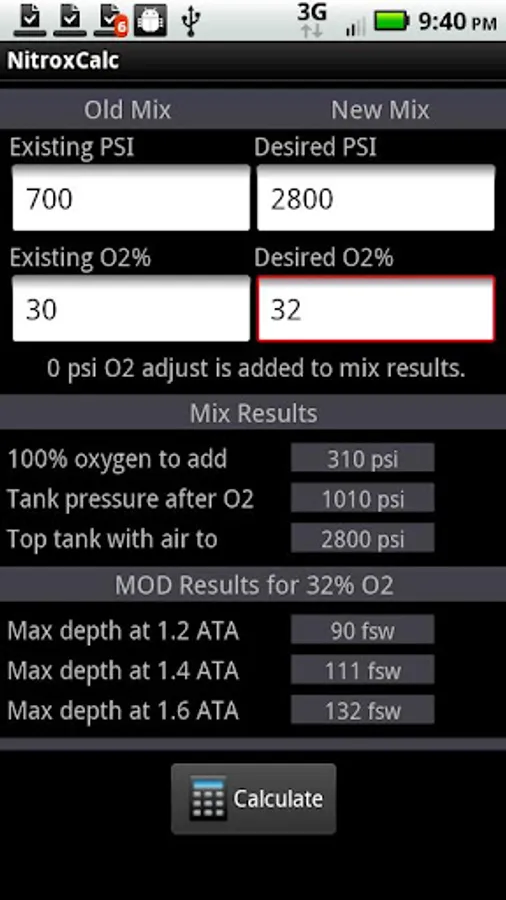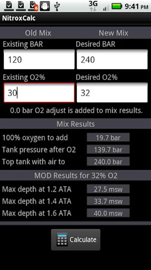Enter the existing pressure and O2% and the desired pressure and O2%. An option is also available that allows an adjustment pressure to be added to the mix results. The app will then display: the amount of 100% oxygen to add, the new tank pressure after adding the oxygen, the top up with air pressure, and maximum operating depth at 1.2, 1.4 and 1.6 ATA for the desired oxygen percentage.