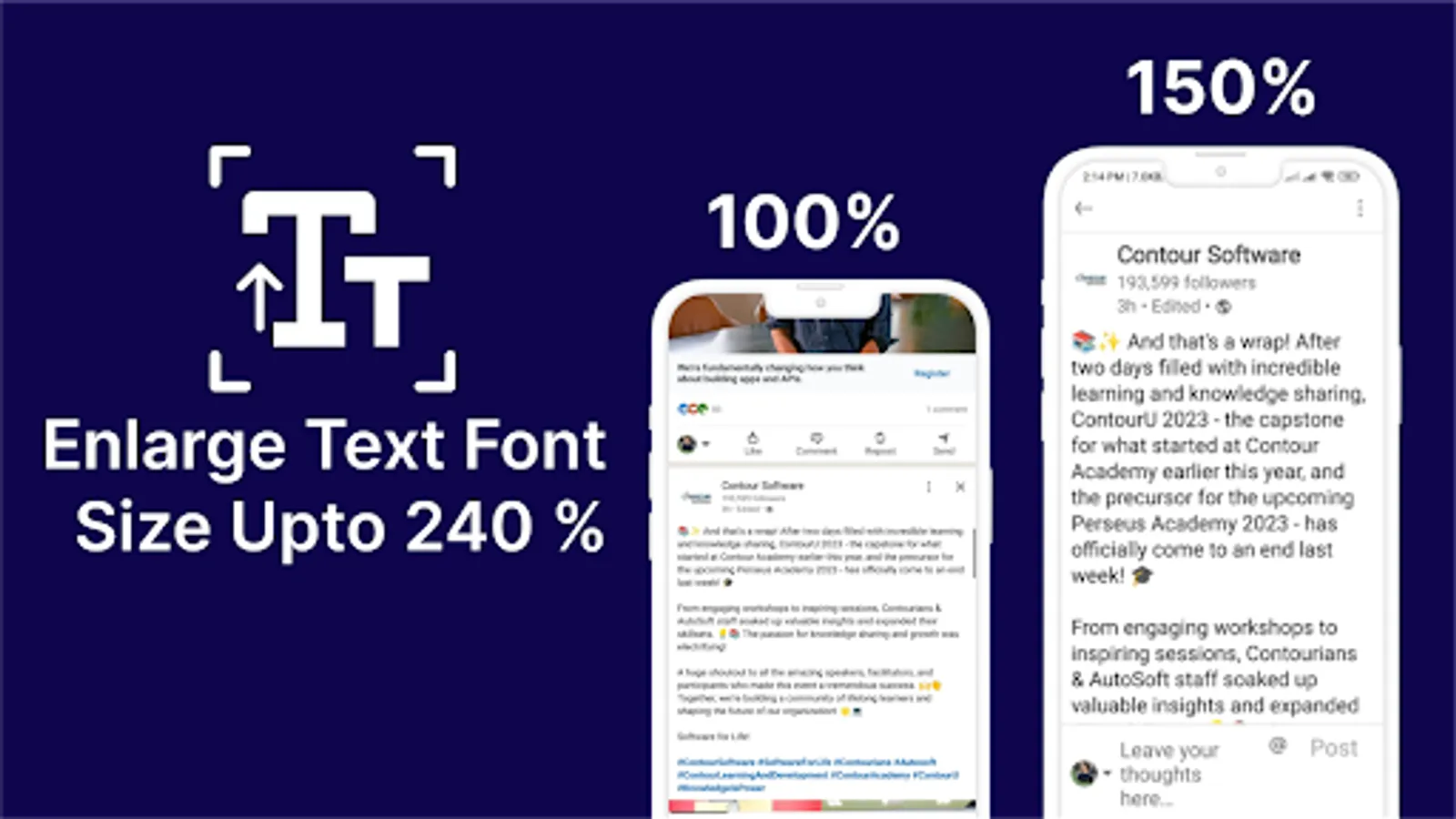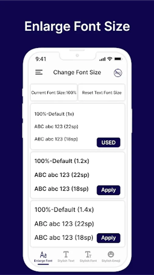 Font Changer & Big font app will easily convert your mobile to small text font and stylish font. Change fonts with fancy text fonts. Enlarge text font size to make the text more visible. You can also reset text font to default size with one click. This fontchanger app will show you exact percentage of applied font size. You can apply various font size text like 100%, 140%, 160%, 180%, & 200%.
