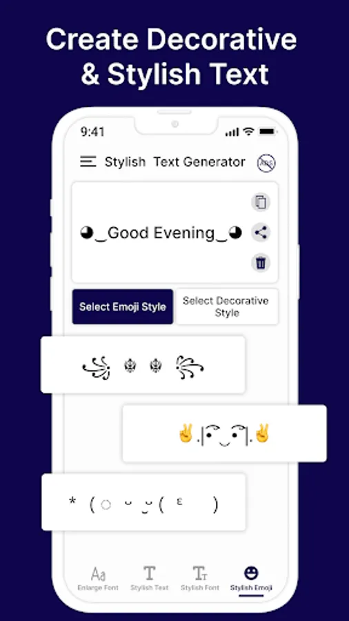 Generate stylish text and stylish font, decorative text with emoji and beautiful symbols. You can also copy and share stylish text and stylish font style with others. Stylish text maker for Android phones. Fancy text generator for Android devices. Nickname generator app generate fancy text symbols and nicknames.