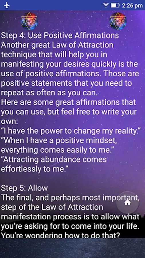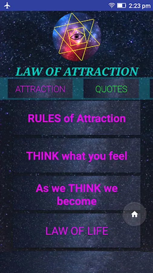 After using LAW OF ATTRACTION application you can attract thoughts, ideas, people, situations and circumstances and achieve your goal or aim.