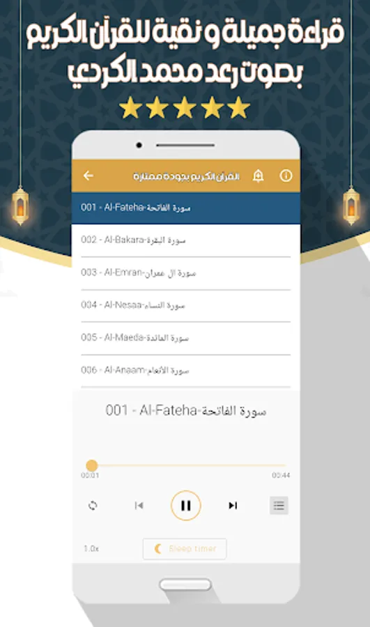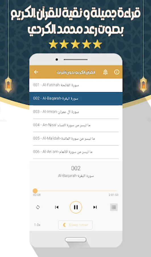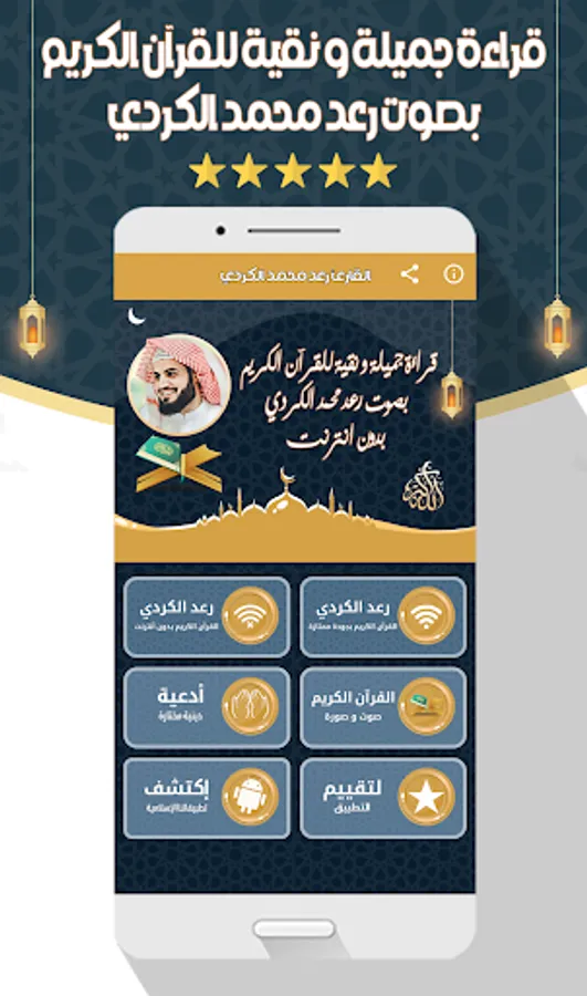 The application of the Noble Qur’an with the voice of Raad Muhammad Al-Kurdi allows you to hear all the surahs of the Noble Qur’an through your phone