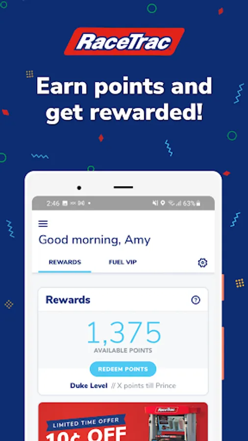 ● Free stuff: The more you show your smiling face at RaceTrac, the more free stuff you get! Earn points and get rewarded when you advance to a higher rewards tier.