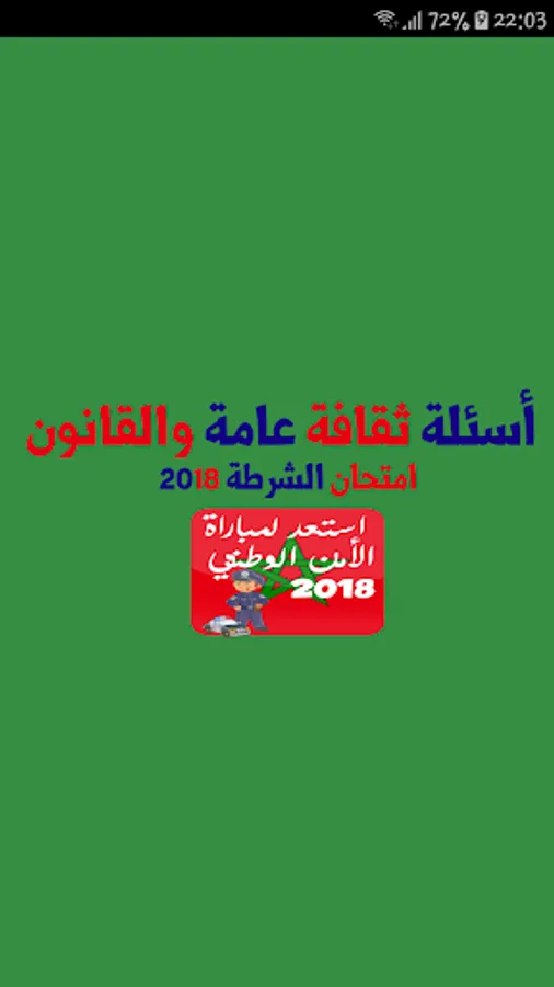 Multiple questions in a variety of fields, including cultural and legal, criminal law, judicial law, family code law, administrative and social law, public law in addition to historical events that changed the course and features of history, whether Arab or Moroccan, whether political, modern and contemporary, and the most important countries And its capitals, in addition to many focused and focused questions about the field of the Moroccan police in terms of laws and future police ethics. In addition, the application contains the correction of the security guard rank match for the September 2017 session and the correction of the inspectors rank match for the September 2017 session.
