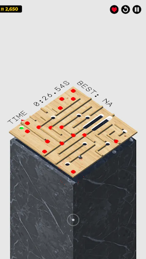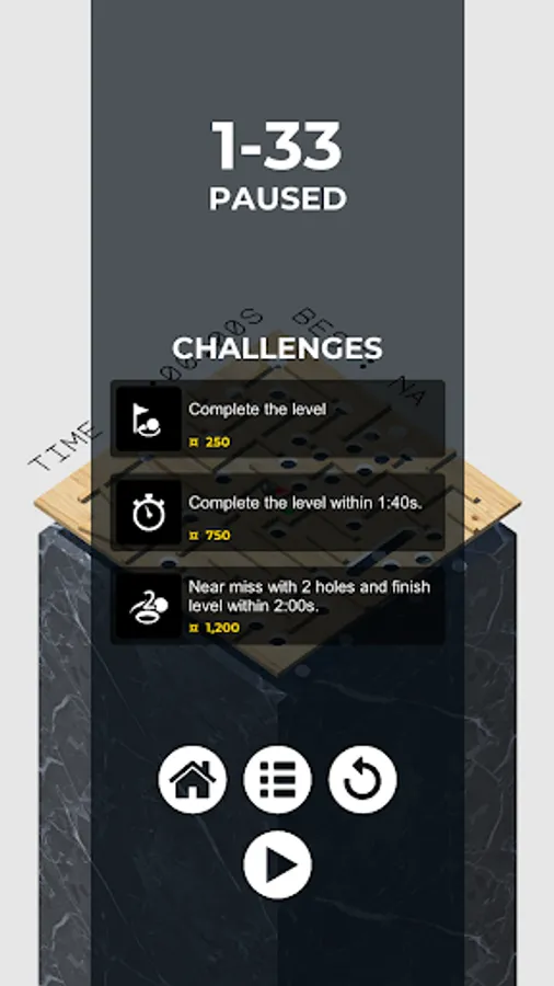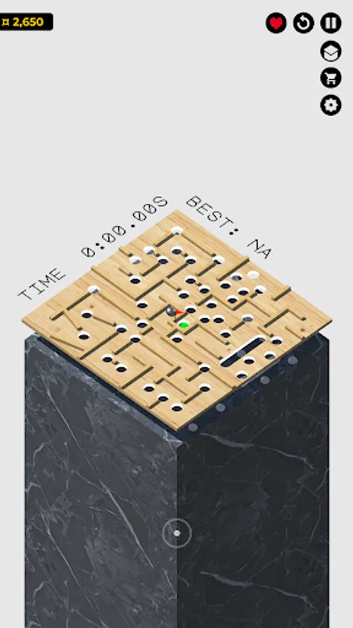 Each maze in Mazey presents different types of challenges, such as completing levels within a certain time limit or completing levels while narrowly avoiding holes. Earn coins by completing challenges and buy different skins for the marble and maze!