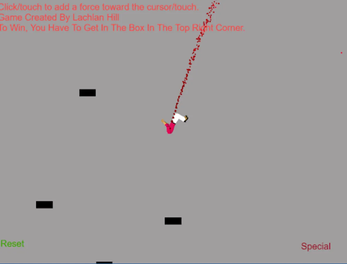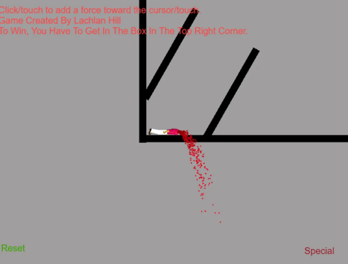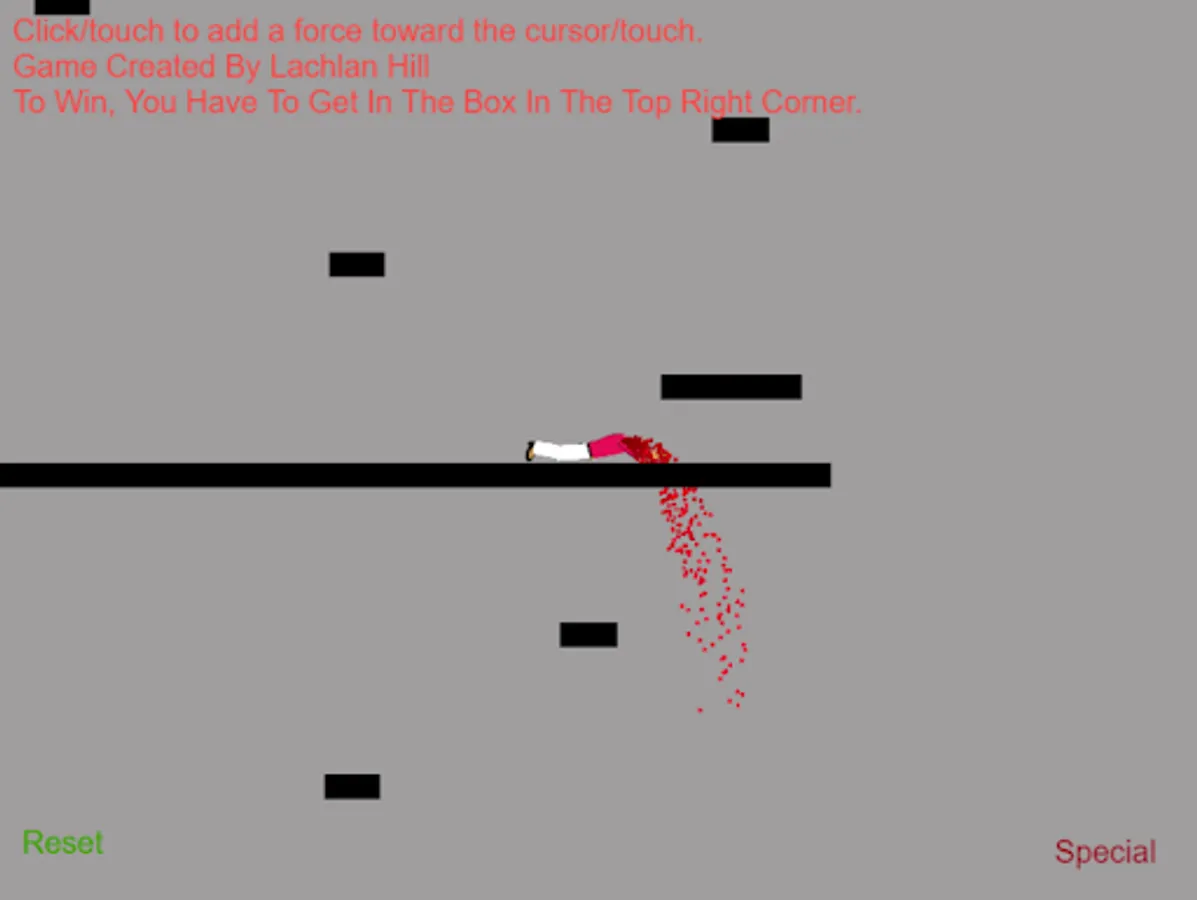 This game is really hard. You have to get in a box in the top right corner. If you do, you win. Every single little thing your head touches, you die and blood squirts out of your head if you play on special mode. Enjoy!