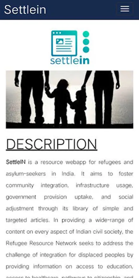 DESCRIPTION: SettleIN is a resource webapp for refugees and asylum-seekers in India. It aims to foster community integration, infrastructure usage, government provision uptake, and social adjustment through its library of simple and targeted articles. In providing a wide-range of content on every aspect of Indian civil society, the Refugee Resource Network seeks to address the challenge of integration for displaced peoples by providing information on access to education, access to healthcare, pathways to citizenship, and other miscellaneous topics which are intended to foster productive, healthy, and empowered re-settlement in India.