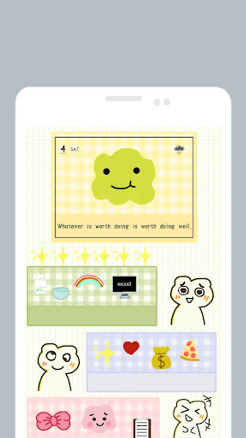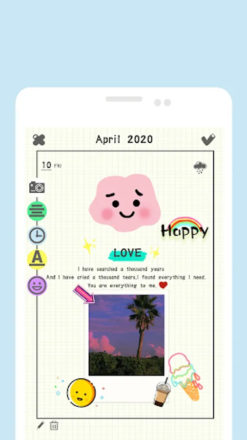 It’s your calendar, diary, notebook. There are functions like mood fonts, weather, password, sticker, sketchpad, time search, language, chart report, etc.. It can insert photos, make your own emoticons and so on.