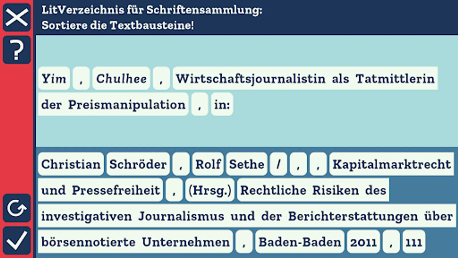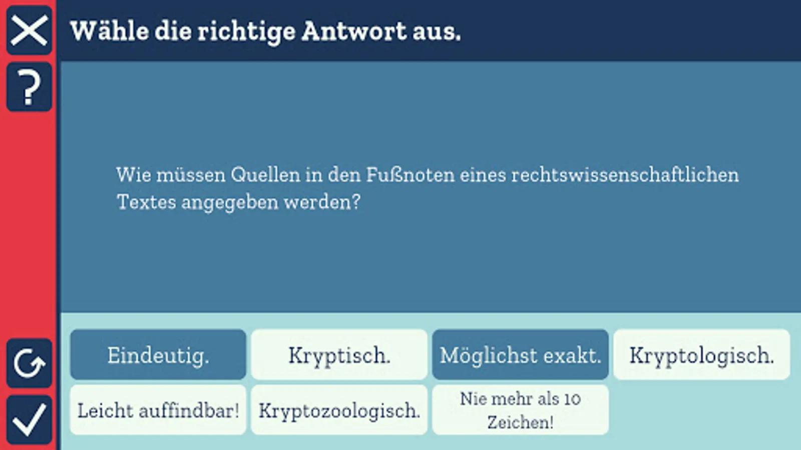 But don't worry: previous knowledge is helpful, but not required! The CitApp conveys the necessary knowledge about footnotes, bibliographies and the correct structuring of texts step by step. This should make it easy to cope with the upcoming tasks - not only in the CitApp, but also in legal homework and later in science and legal practice.