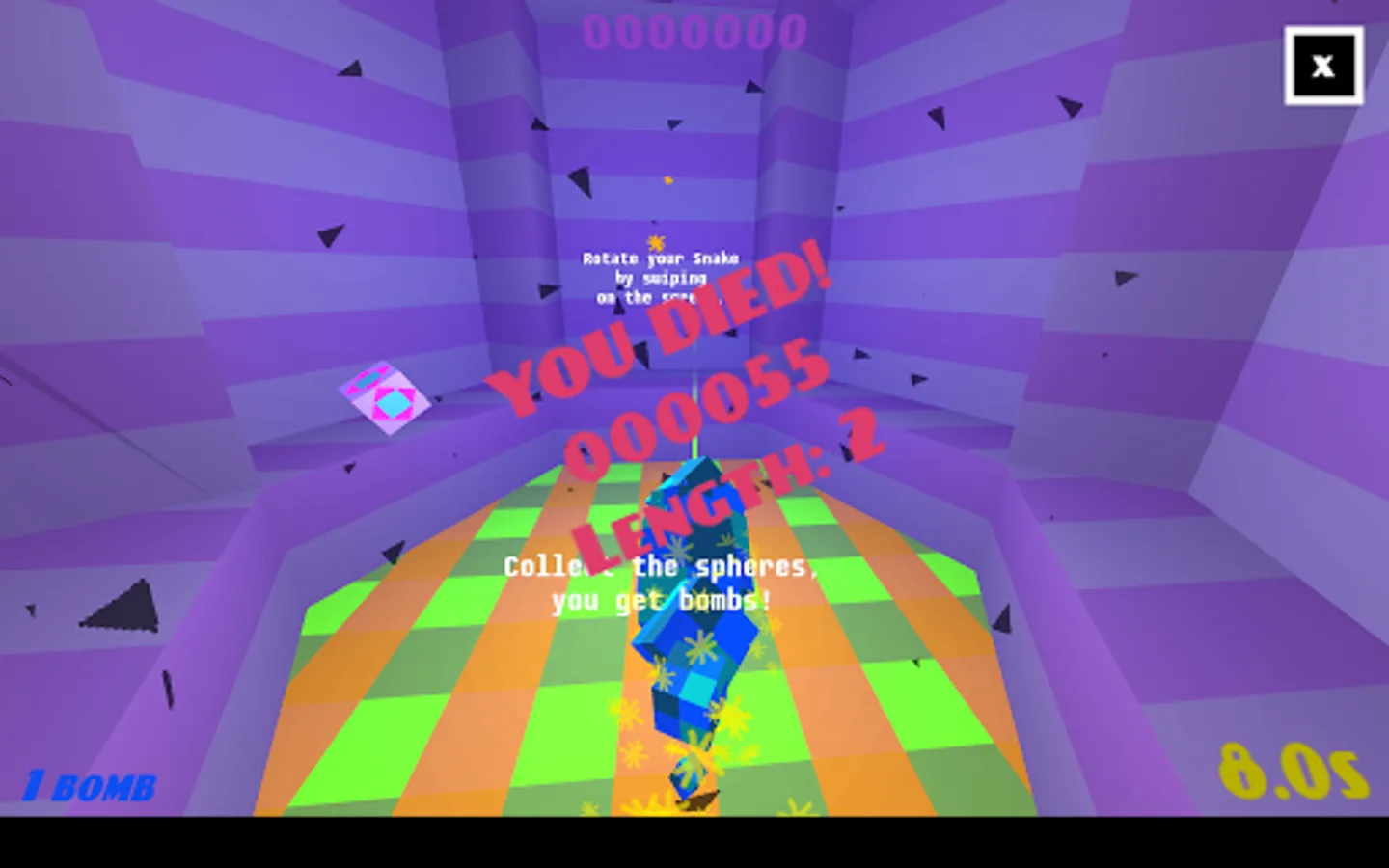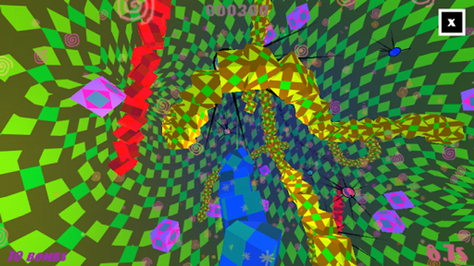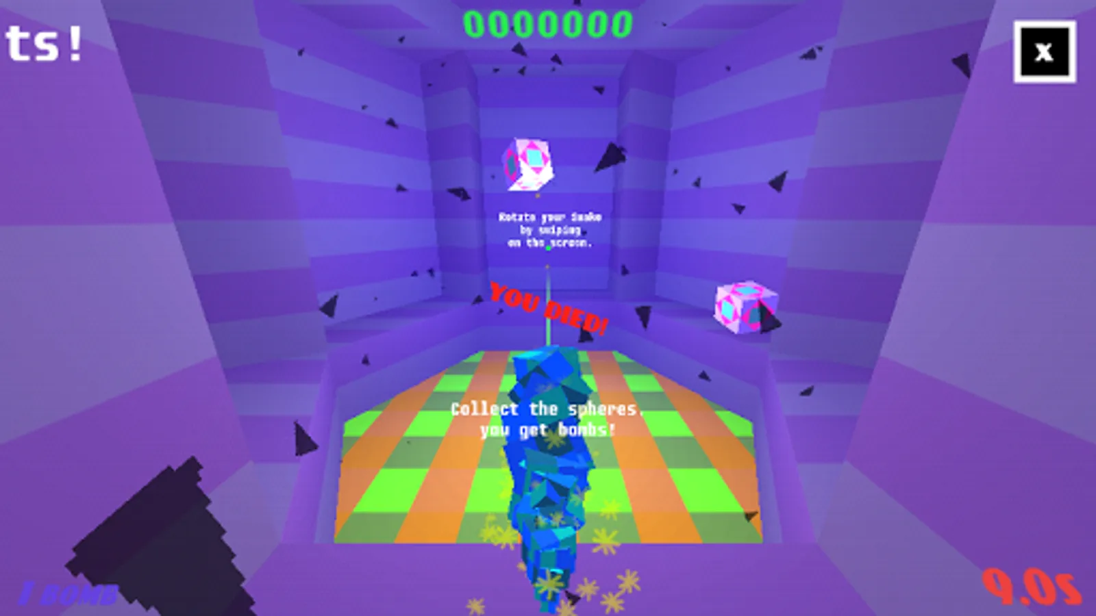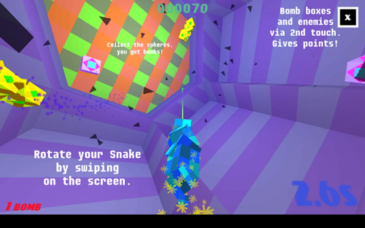 You're a space-snake in a box, every 10 seconds your tail becomes a wall, you can use bombs, and the colors are pretty strange. There are other snakes and boxes and wtf