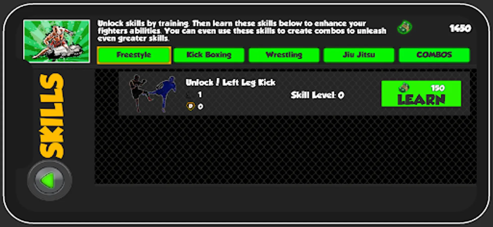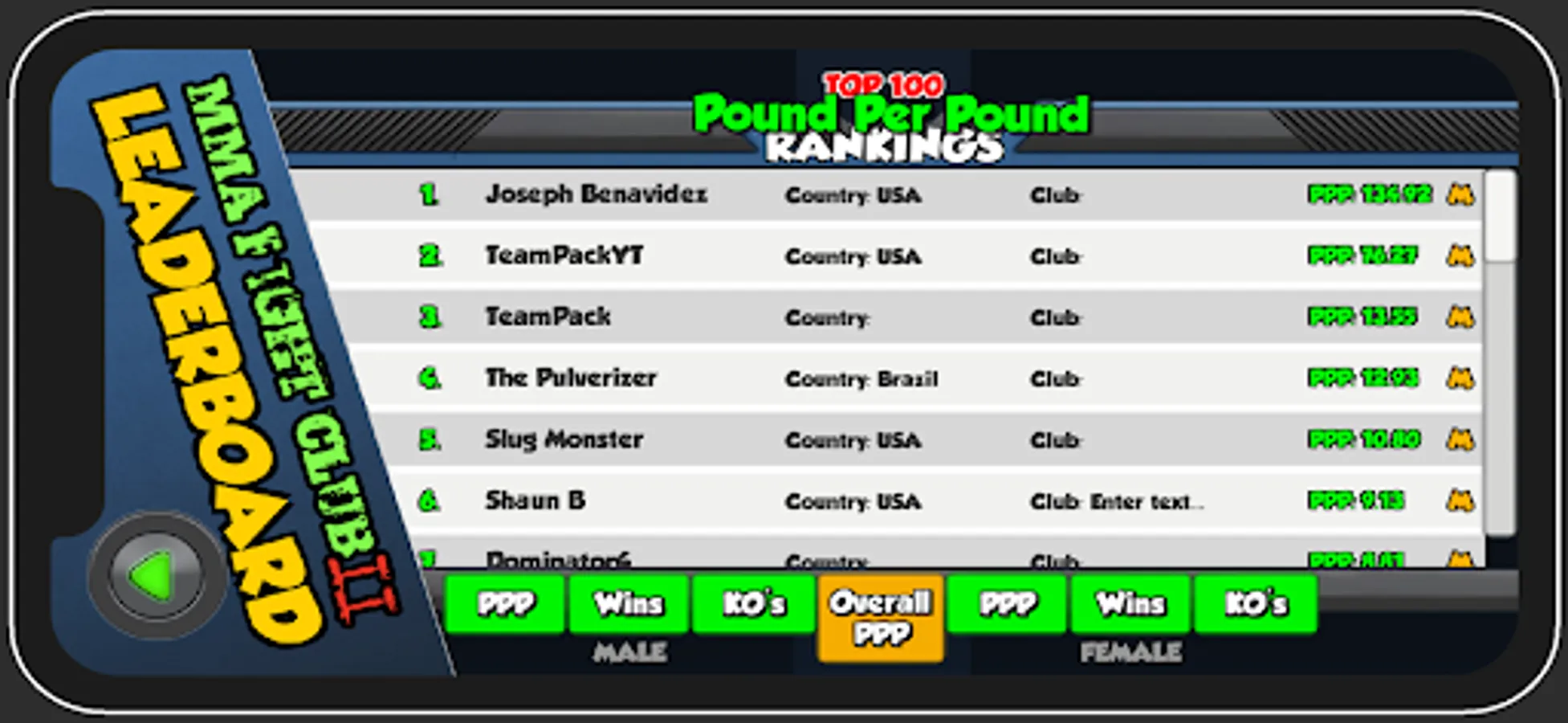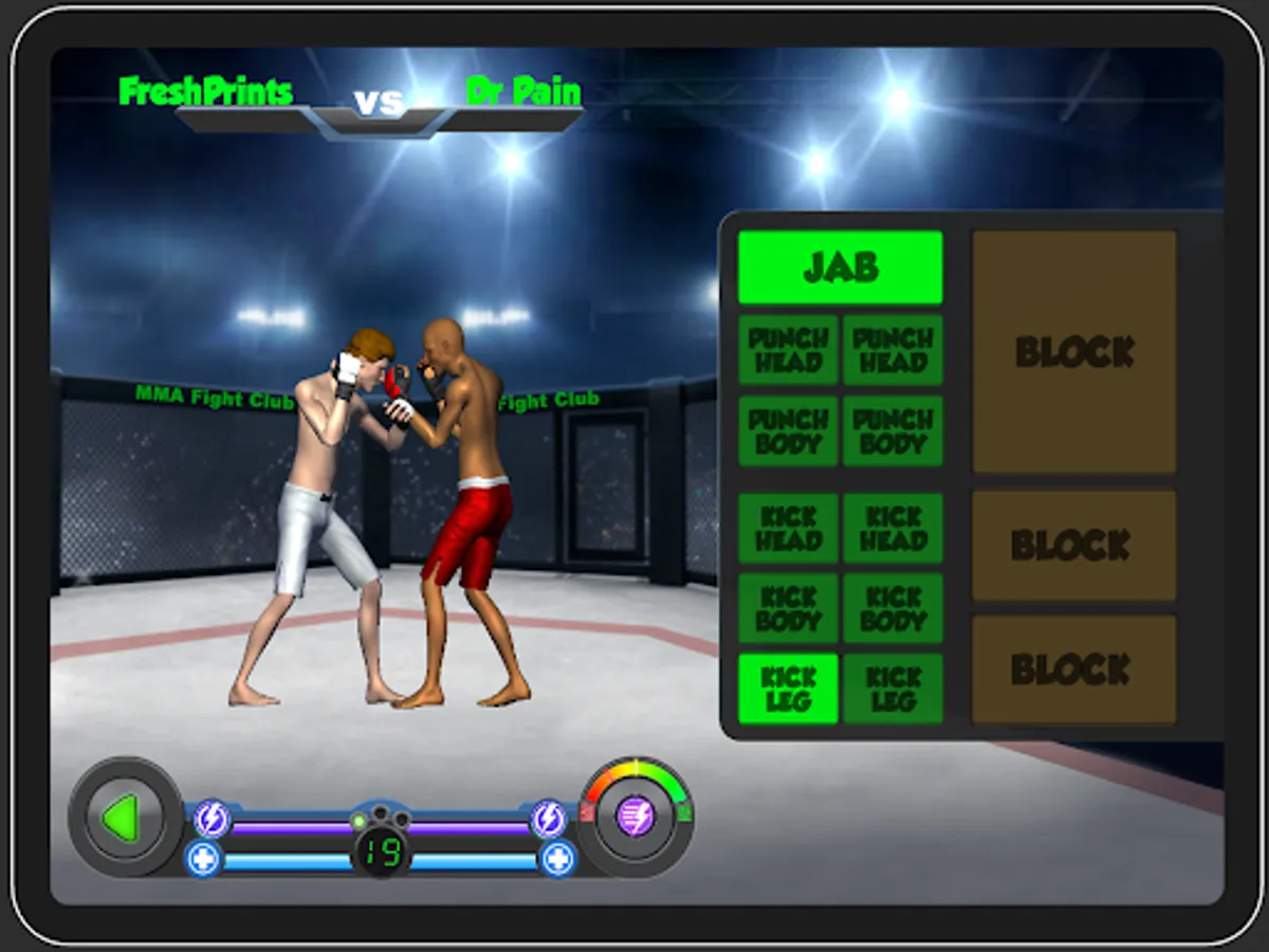 MMA Fight Club is back and better than ever! It's now the perfect blend of a strategy and fighting game. Create your own MMA fighter, train them, learn new skills, create new combos and battle your way to the top of the pound per pound rankings. Male and female fighters are now supported along with your choice of hair styles, facial features, colors and more. Invite your friends to your club and increase your fighters offensive and defensive skills. Train different areas of your fighters attributes with a variety of mini games. Buy gyms to increase your income enabling you to purchase more powerful skills. Combine skills to create combos for ultra powerful additions to your offense and defense. Take on ranked fighters and earn double bucks when you knock them out! Can you fight your way to the top? Create! Train! Dominate!