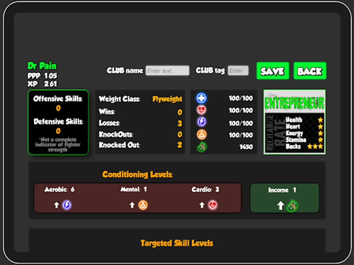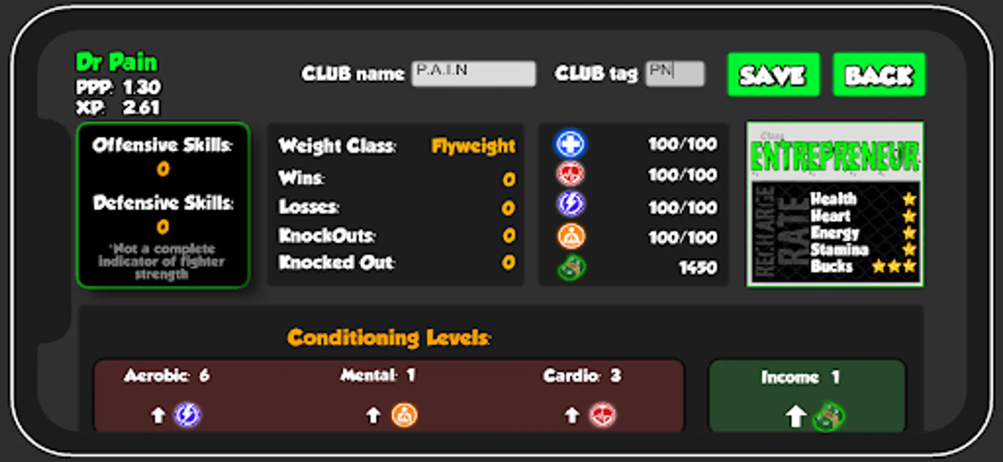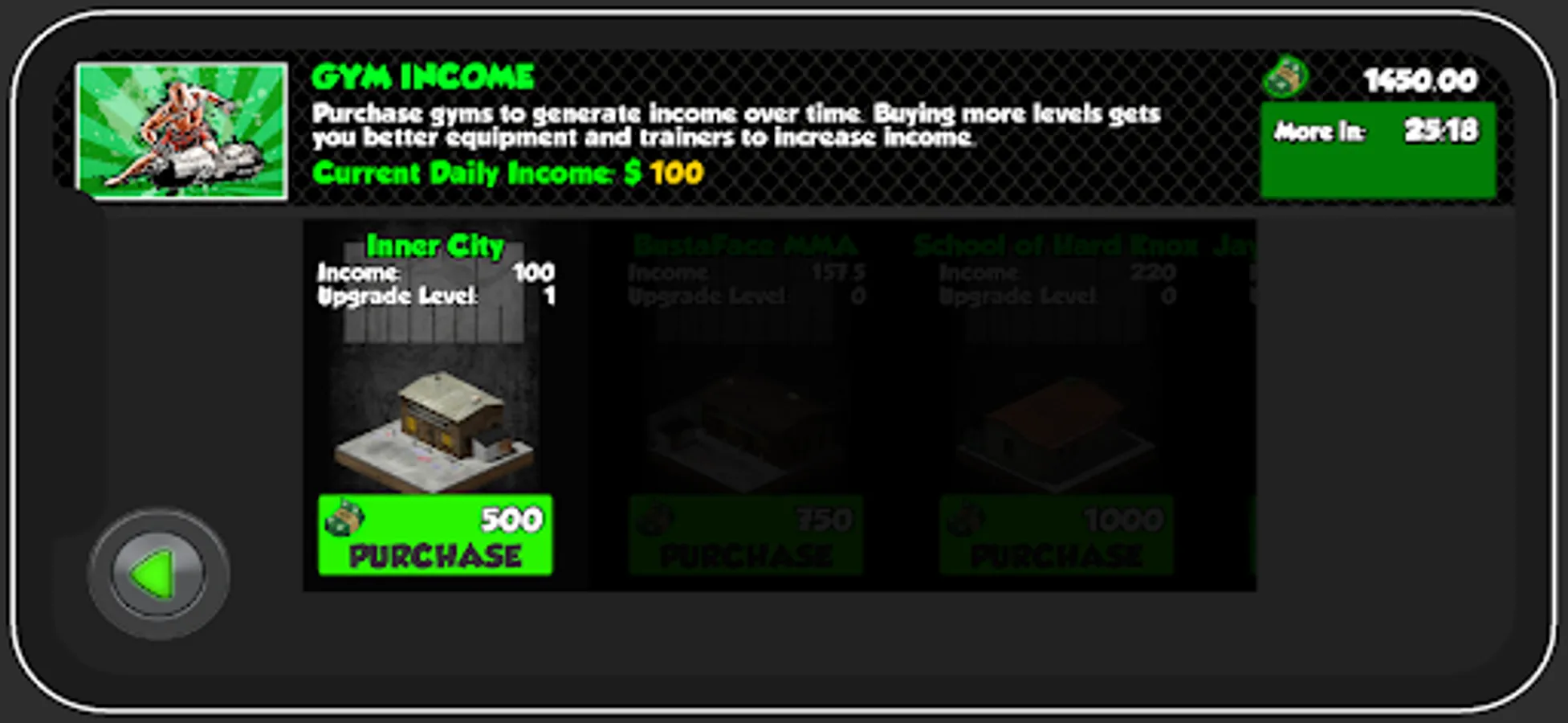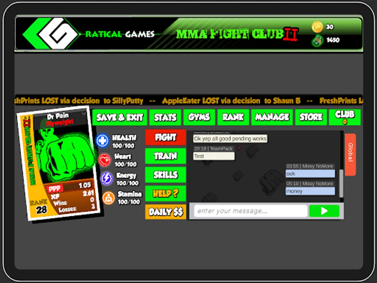 MMA Fight Club is back and better than ever! It's now the perfect blend of a strategy and fighting game. Create your own MMA fighter, train them, learn new skills, create new combos and battle your way to the top of the pound per pound rankings. Male and female fighters are now supported along with your choice of hair styles, facial features, colors and more. Invite your friends to your club and increase your fighters offensive and defensive skills. Train different areas of your fighters attributes with a variety of mini games. Buy gyms to increase your income enabling you to purchase more powerful skills. Combine skills to create combos for ultra powerful additions to your offense and defense. Take on ranked fighters and earn double bucks when you knock them out! Can you fight your way to the top? Create! Train! Dominate!