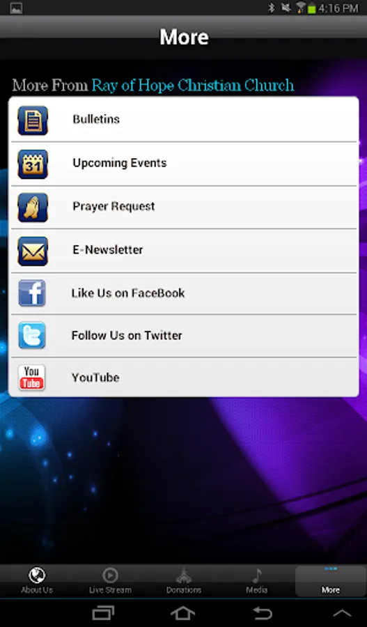This is the official Ray of Hope Christian Church Android Application. Download this FREE App today to connect with Ray of Hope Christian Church and experience our messages. Watch our services LIVE, listen to music and more. The Ray of Hope Christian Church App was created by The Church Online.