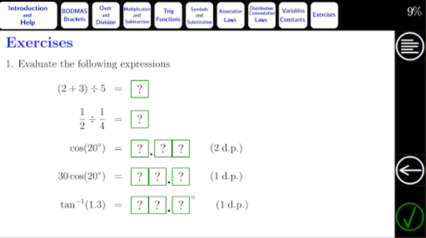 In this tutorial, we look at how to evaluate expressions with BODMAS, and how to use a scientific calculator to evaluate trig functions. We then look at the basic laws of algebra (associative, distributive, and commutative). We finally introduce constants, independent variables, dependent variables and substitution.