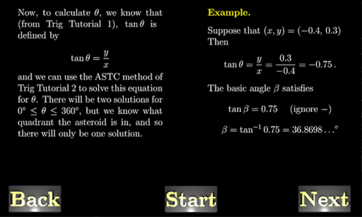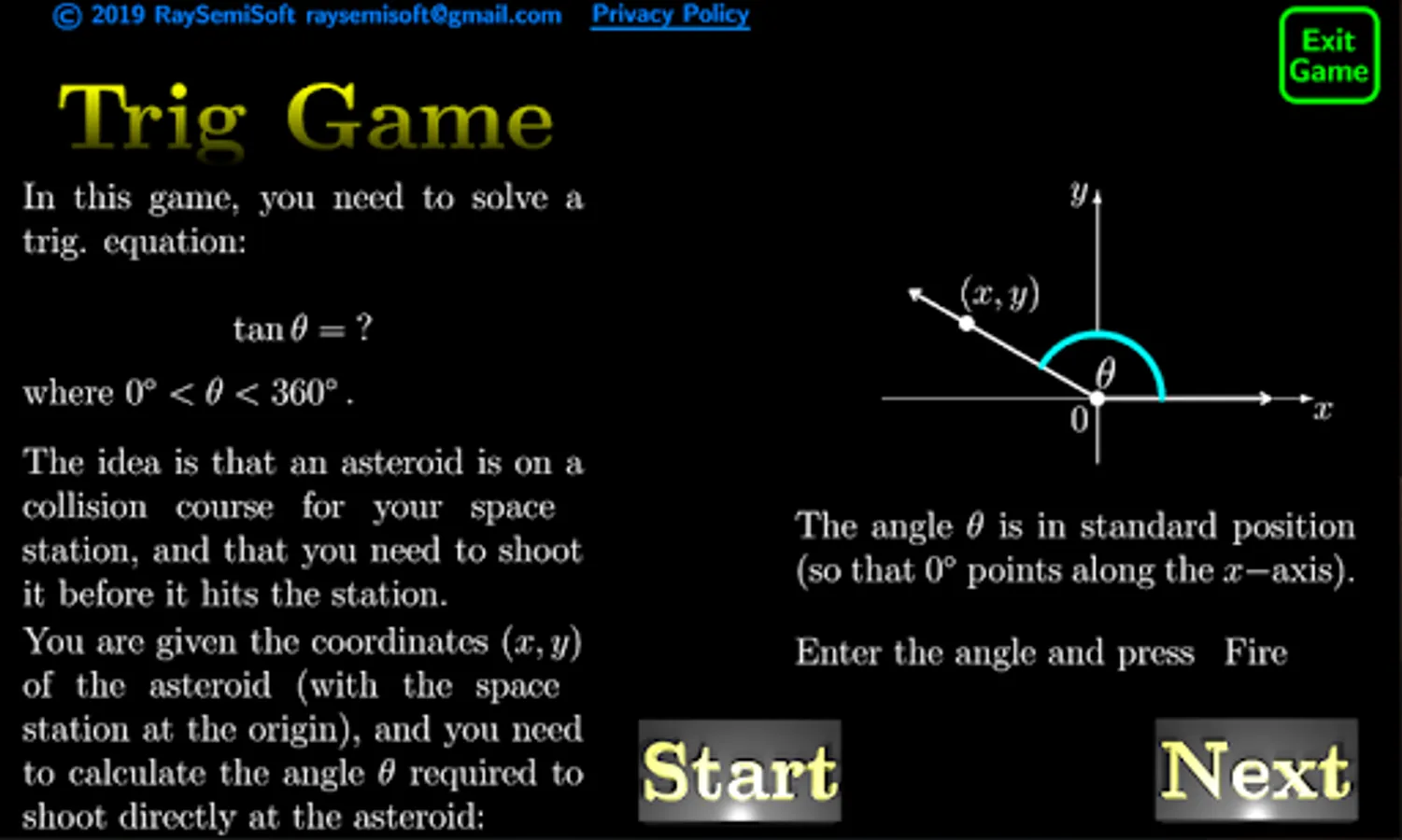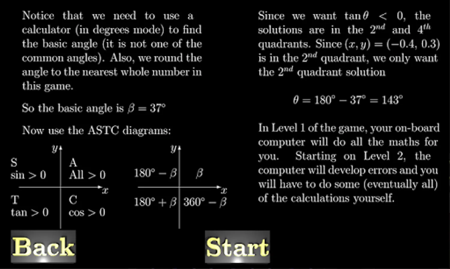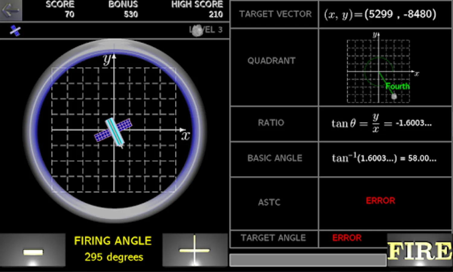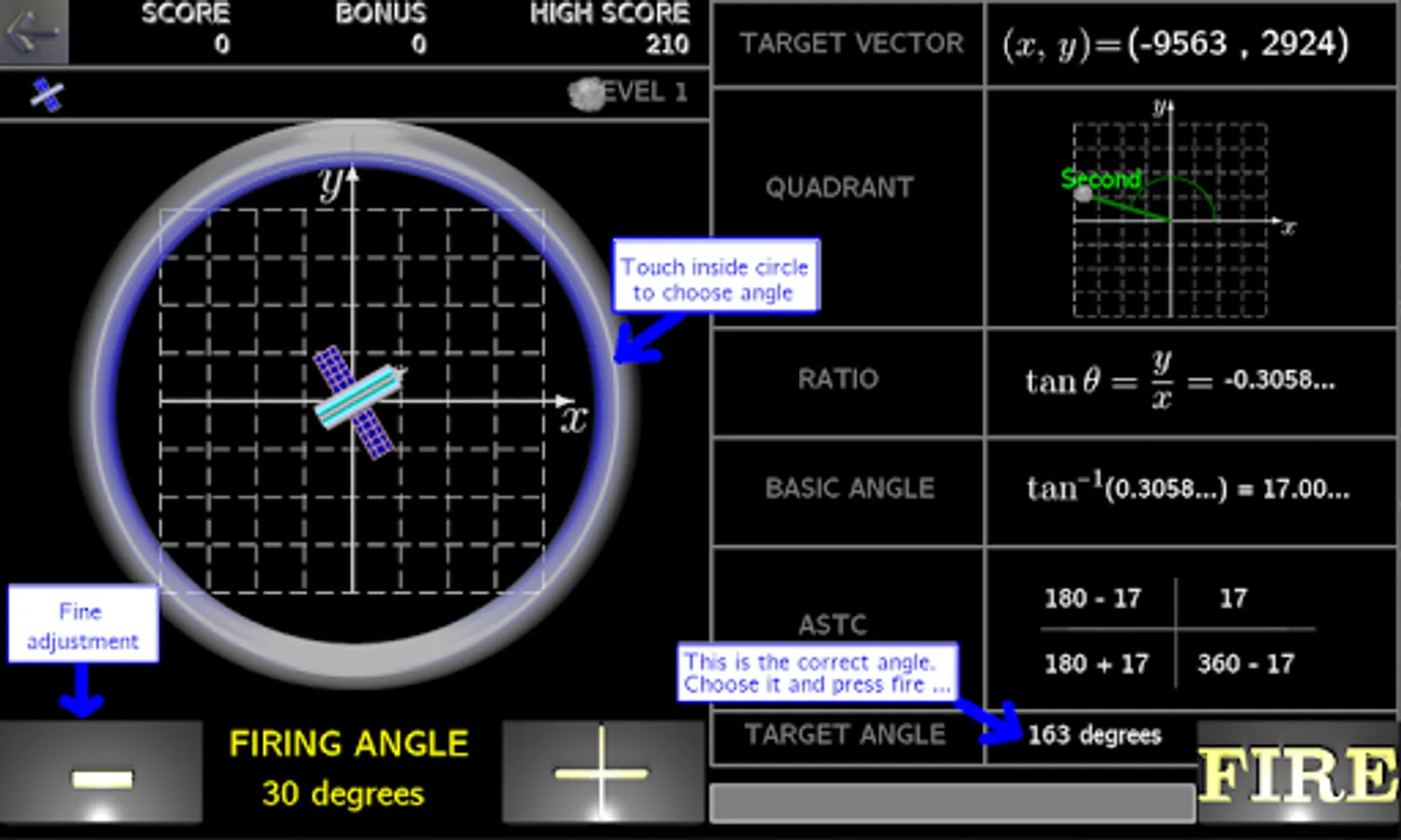This game is an arcade style game with increasing difficulty. Given the co-ordinates (x,y) of an asteroid, you need to calculate the corresponding angle (by solving a tangent equation) to shoot it.